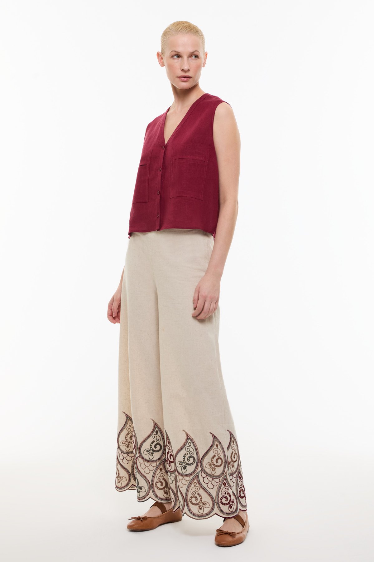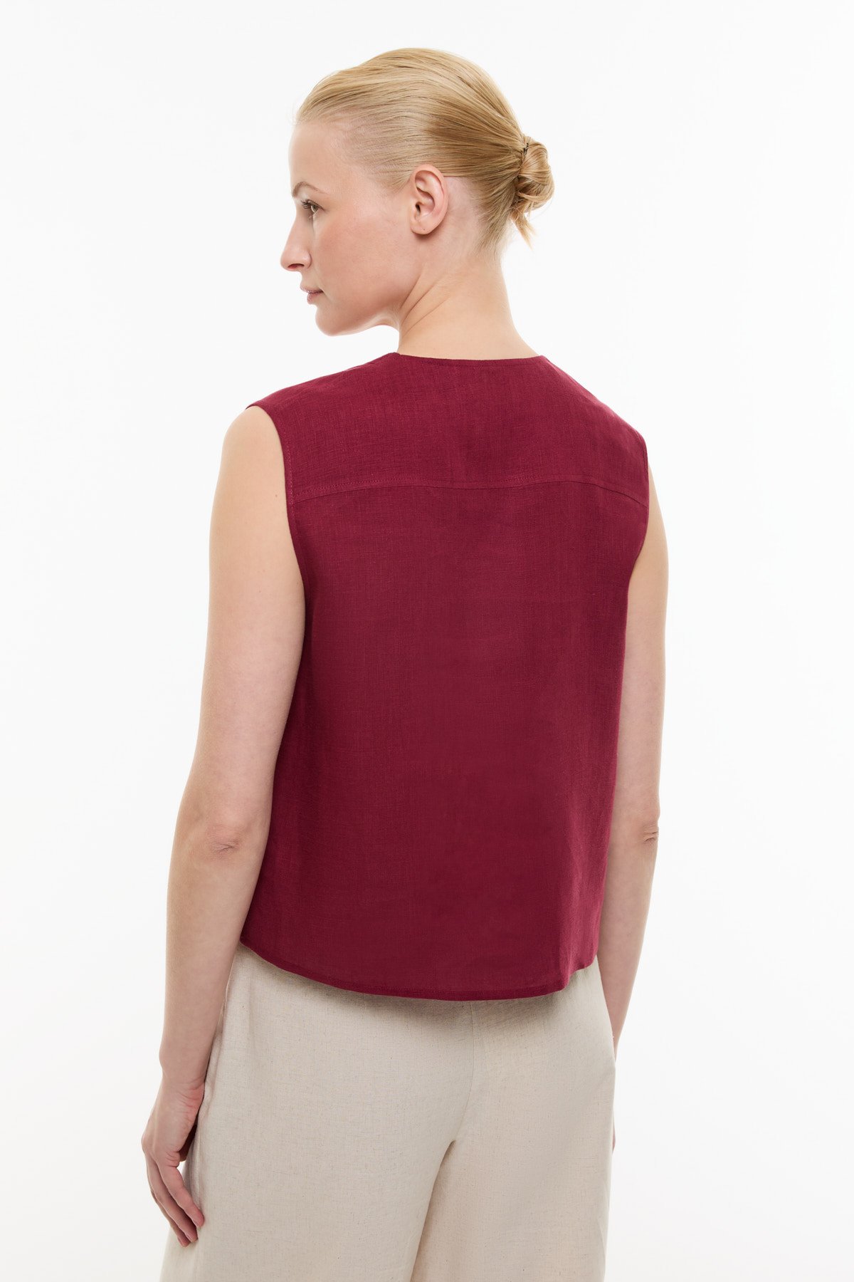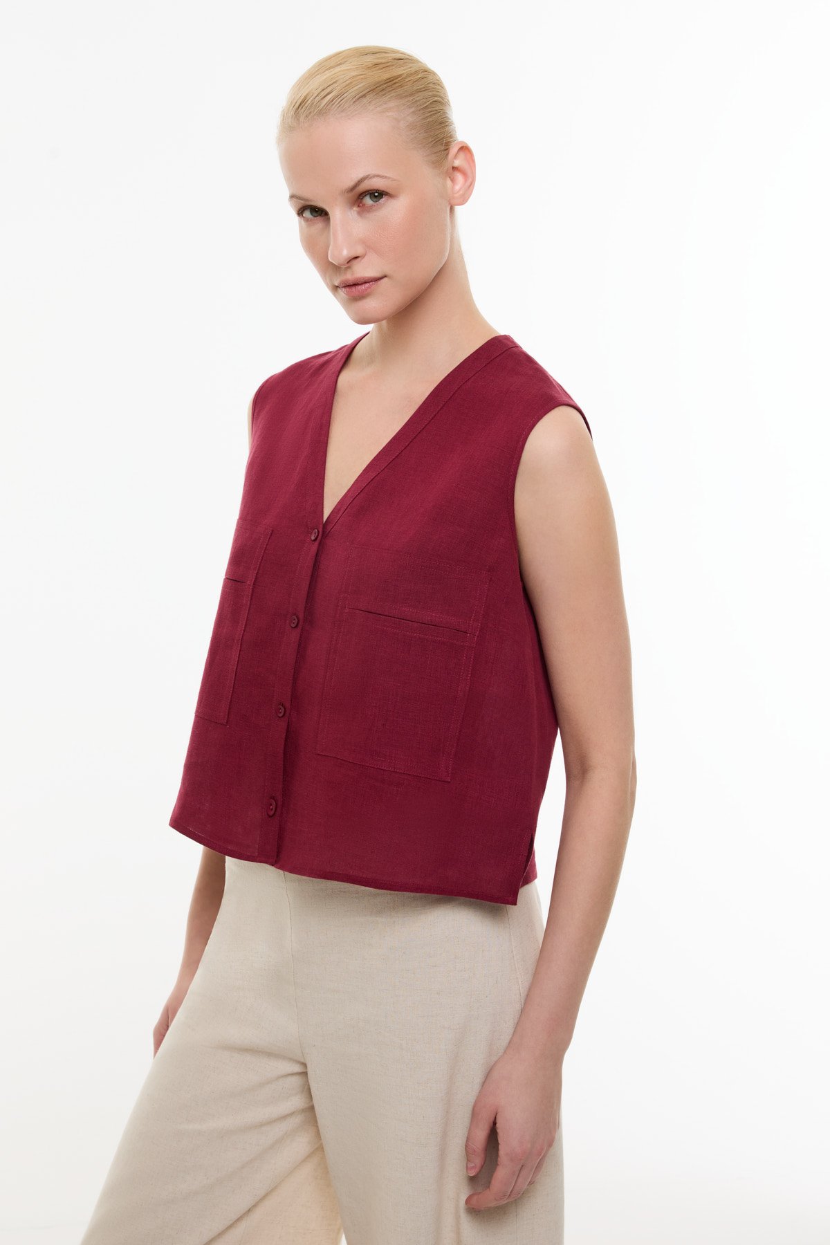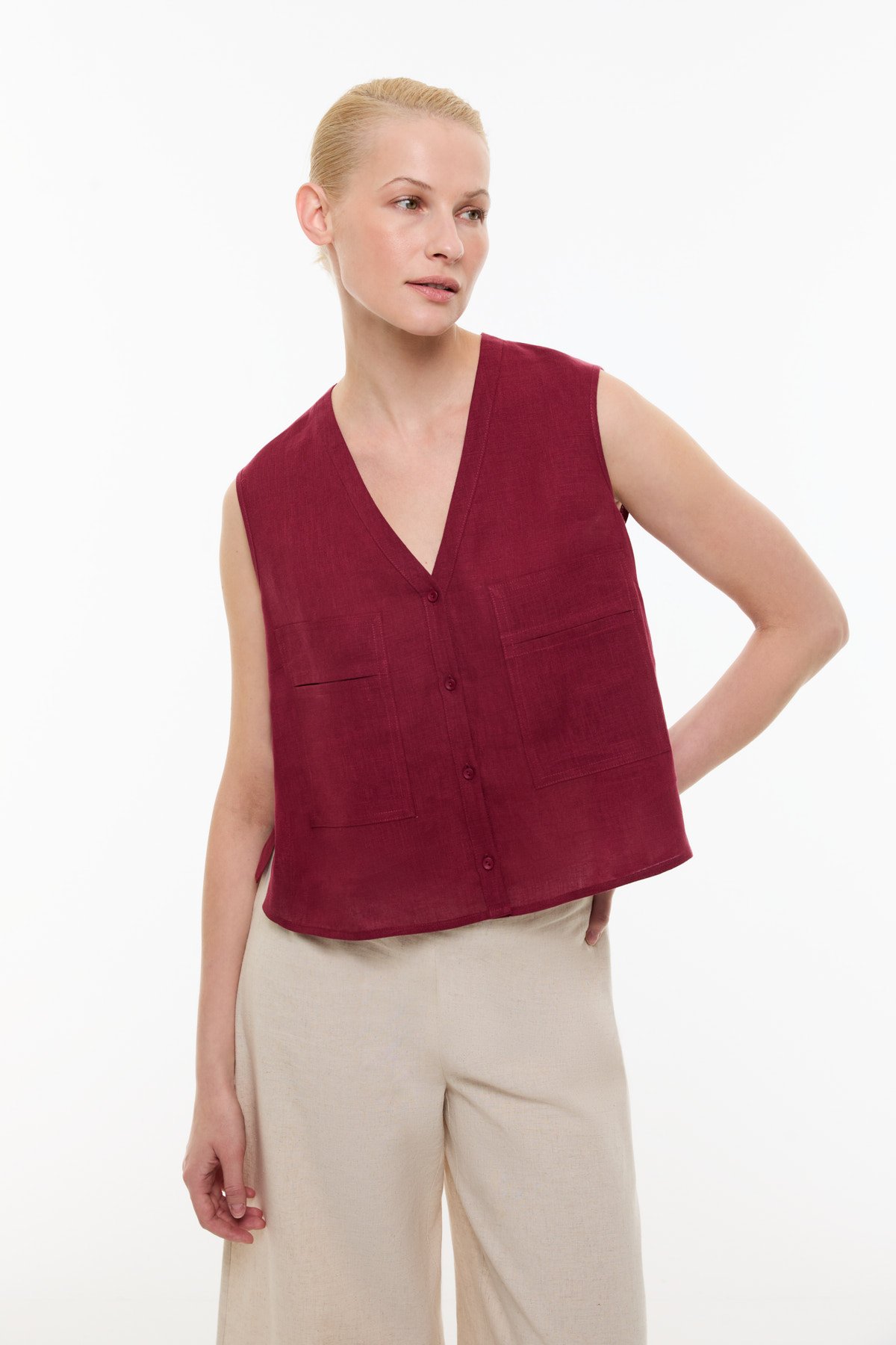Çift Cepli Keten Gömlek Bordo