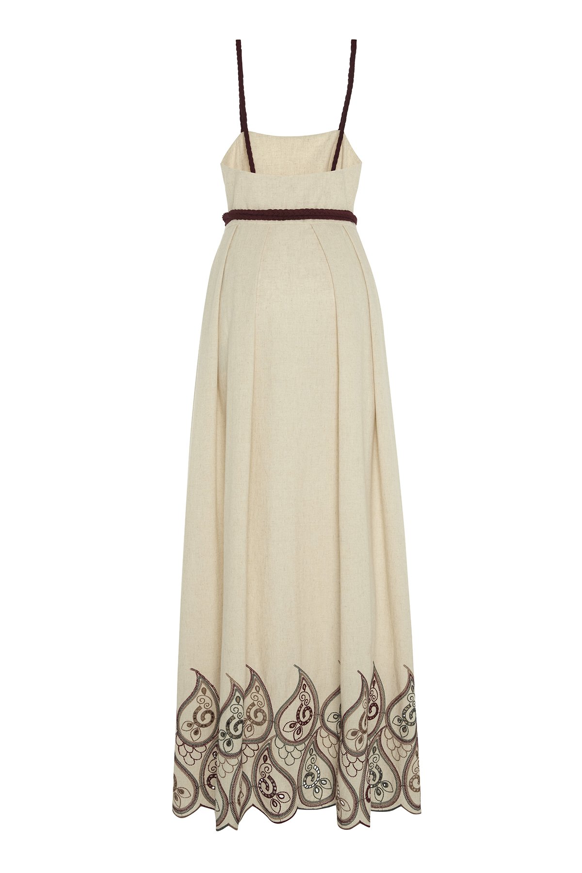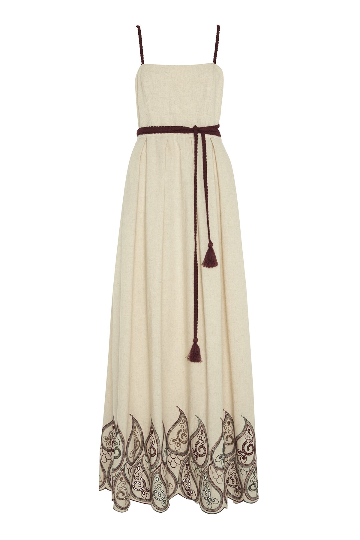V Yaka Önü Düğmeli Kolsuz Keten Maksi Boy Elbise Bej