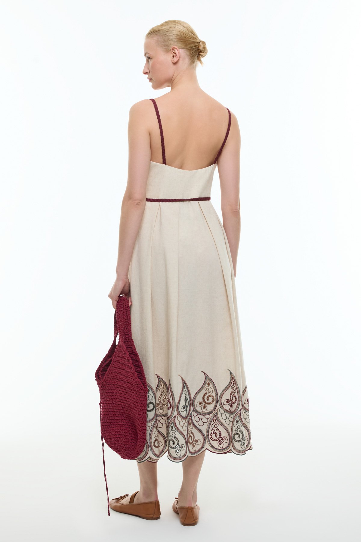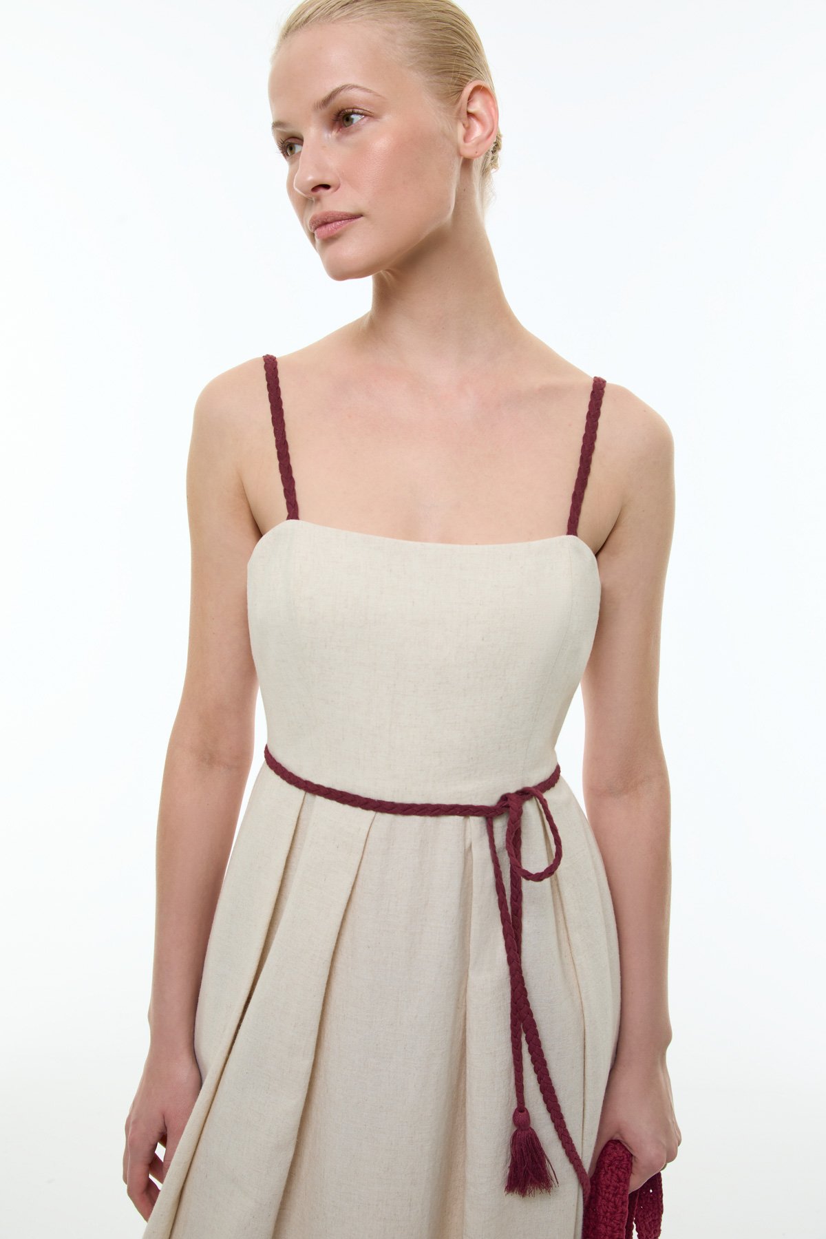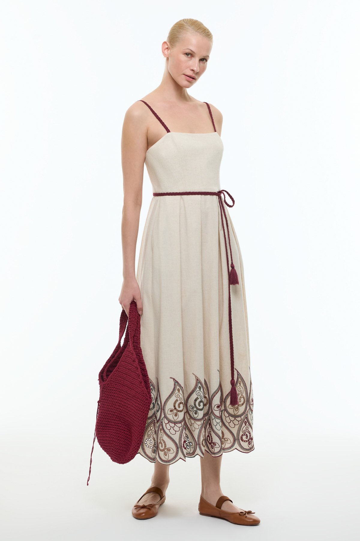 %100 Keten Kruvaze Görünümlü Beli Kemerli Midi Boy Elbise Haki