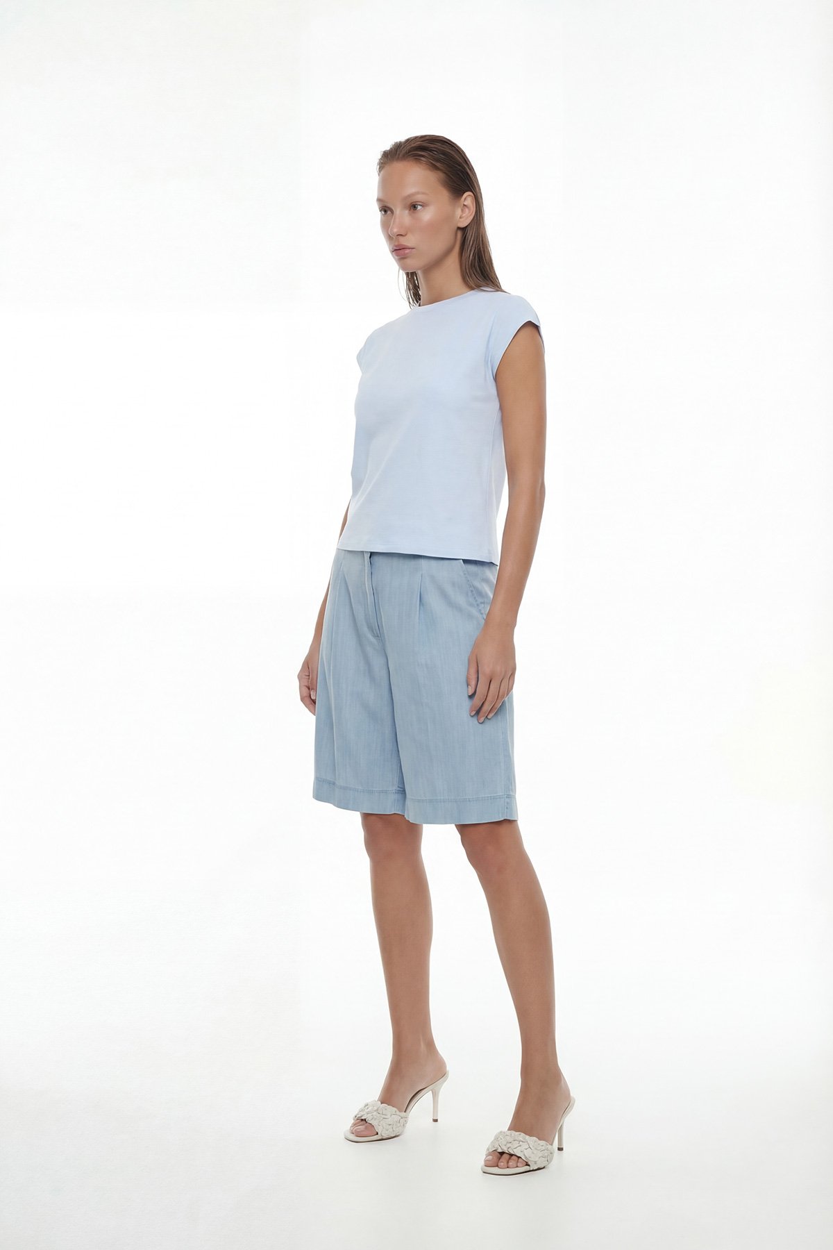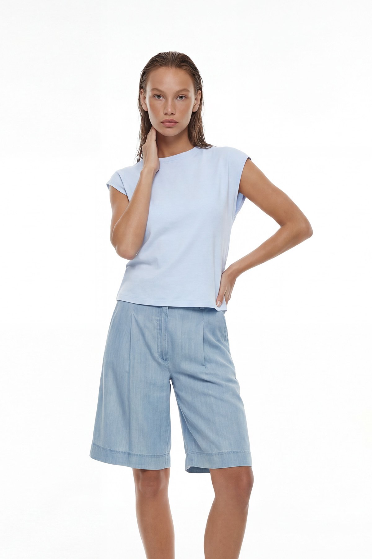 Düşük Omuzlu Bisiklet Yaka T-shirt Mavi