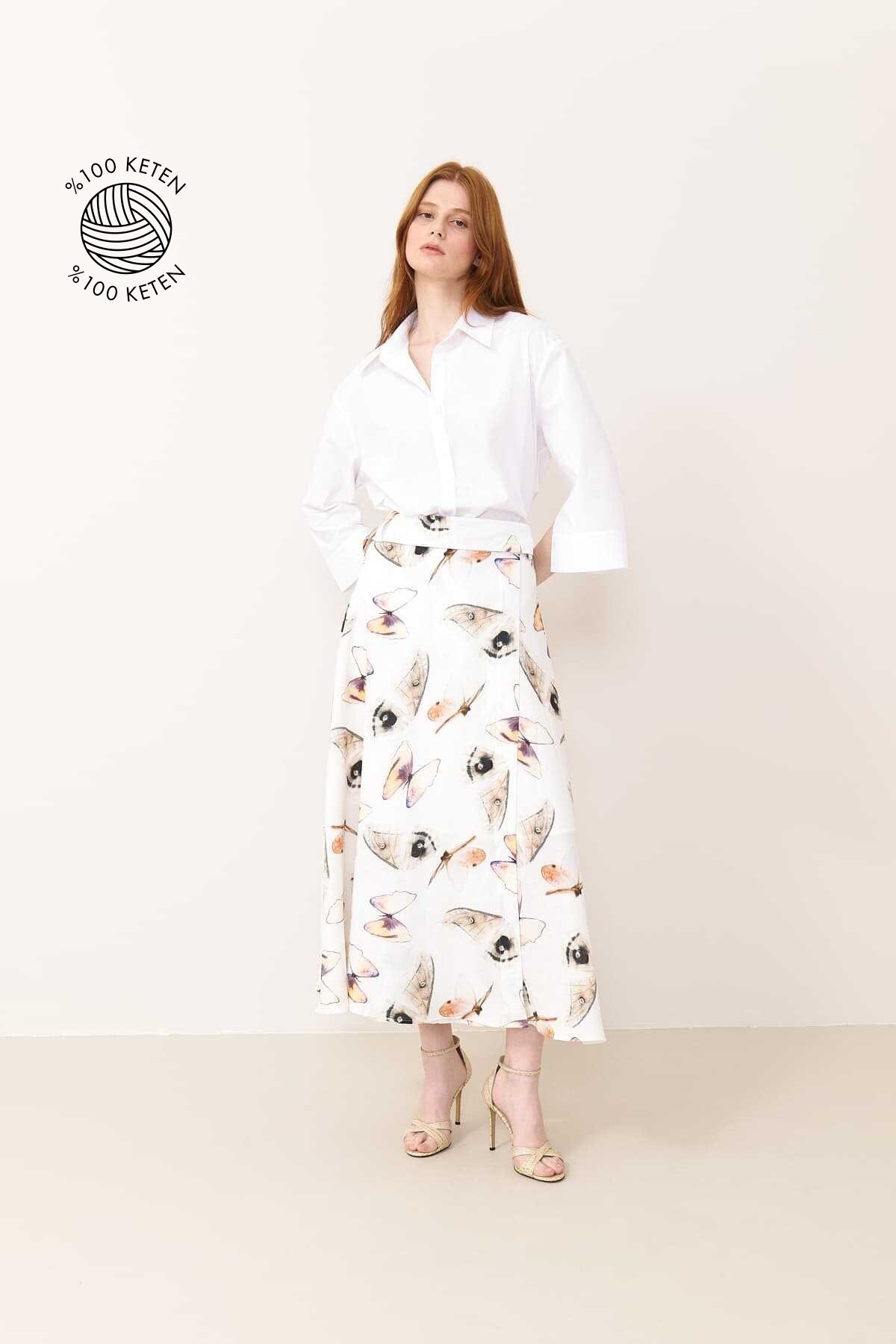 kelebek baskılı kruvaze midi boy keten etek MODEL ÖLÇÜLERİ: Beden: 36 Boy: 177-178 cm Göğüs: 80-84 cm Bel: 60-62 cm Kalça: 89-92 cm Model S Beden Giymektedir.