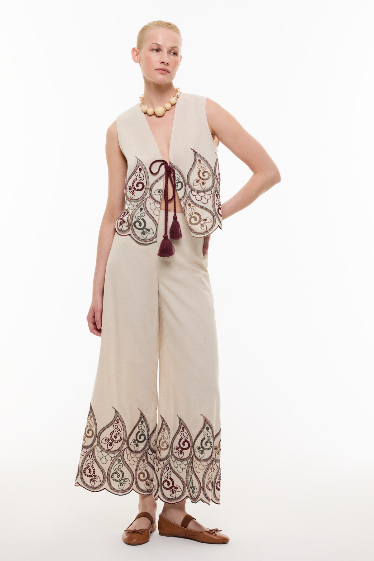 Kemer Detaylı Kruvaze Keten Yelek Kahve
