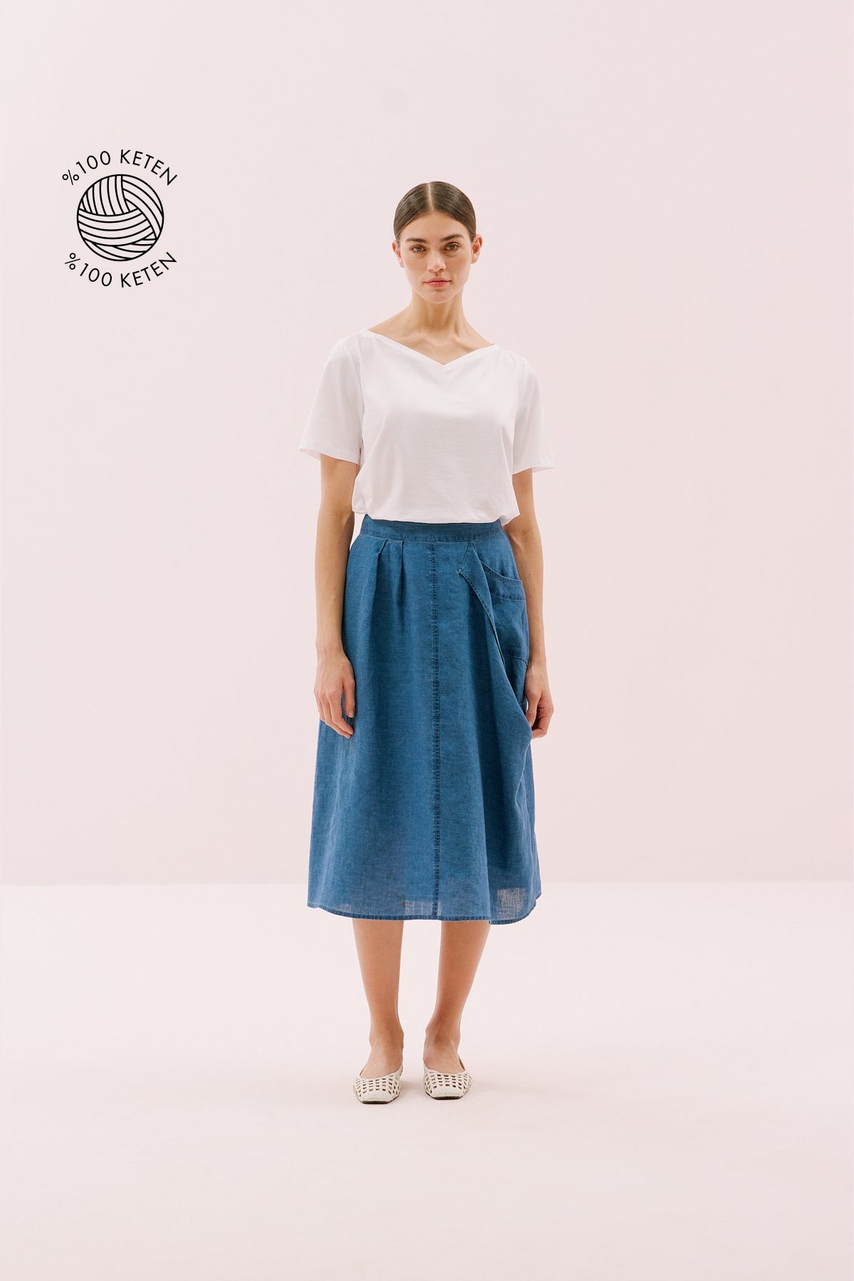 Tek Cep Detaylı Beli Lastikli Keten Midi Boy Etek İndigo