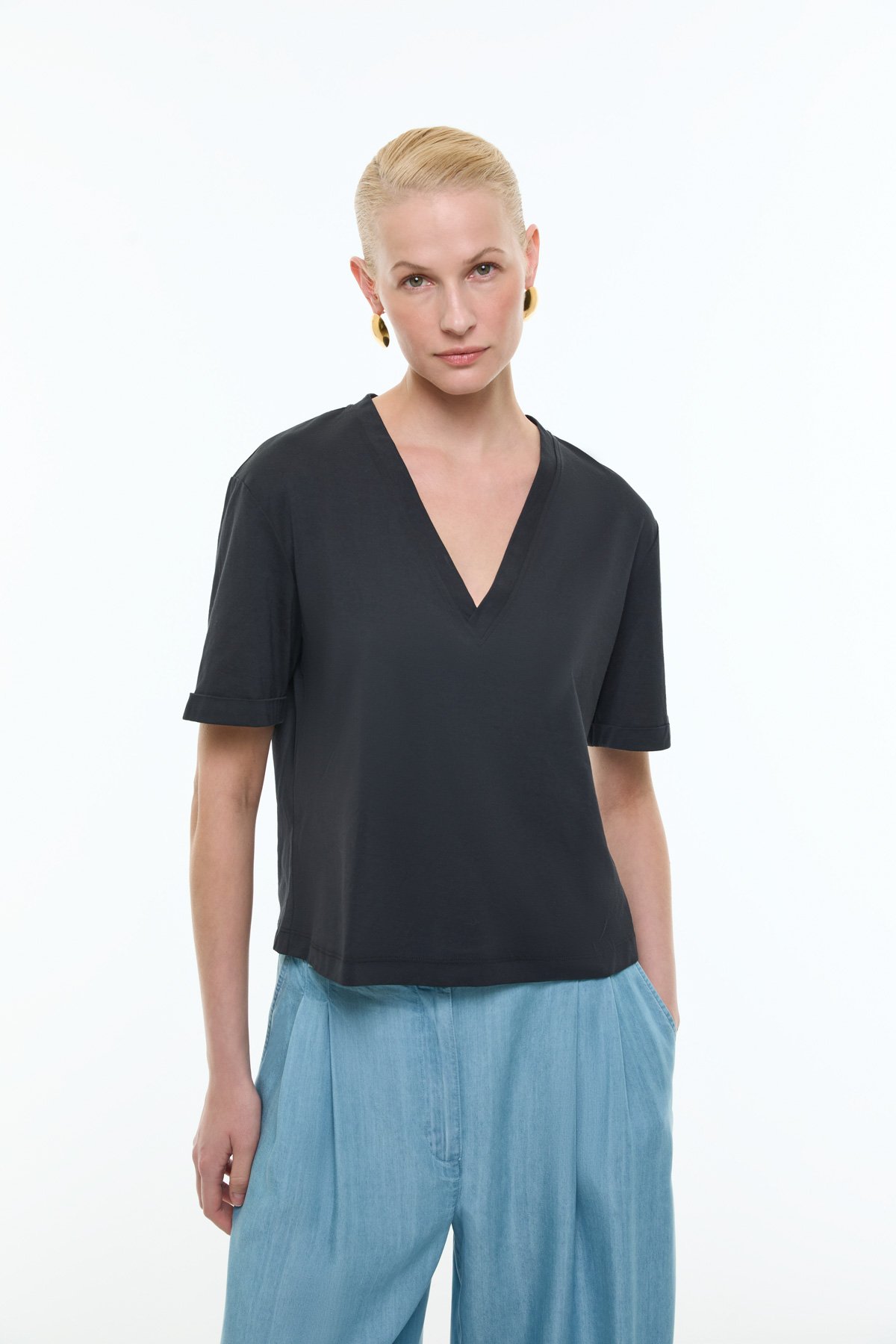 V Yaka Double Kısa Kol T-shirt Siyah