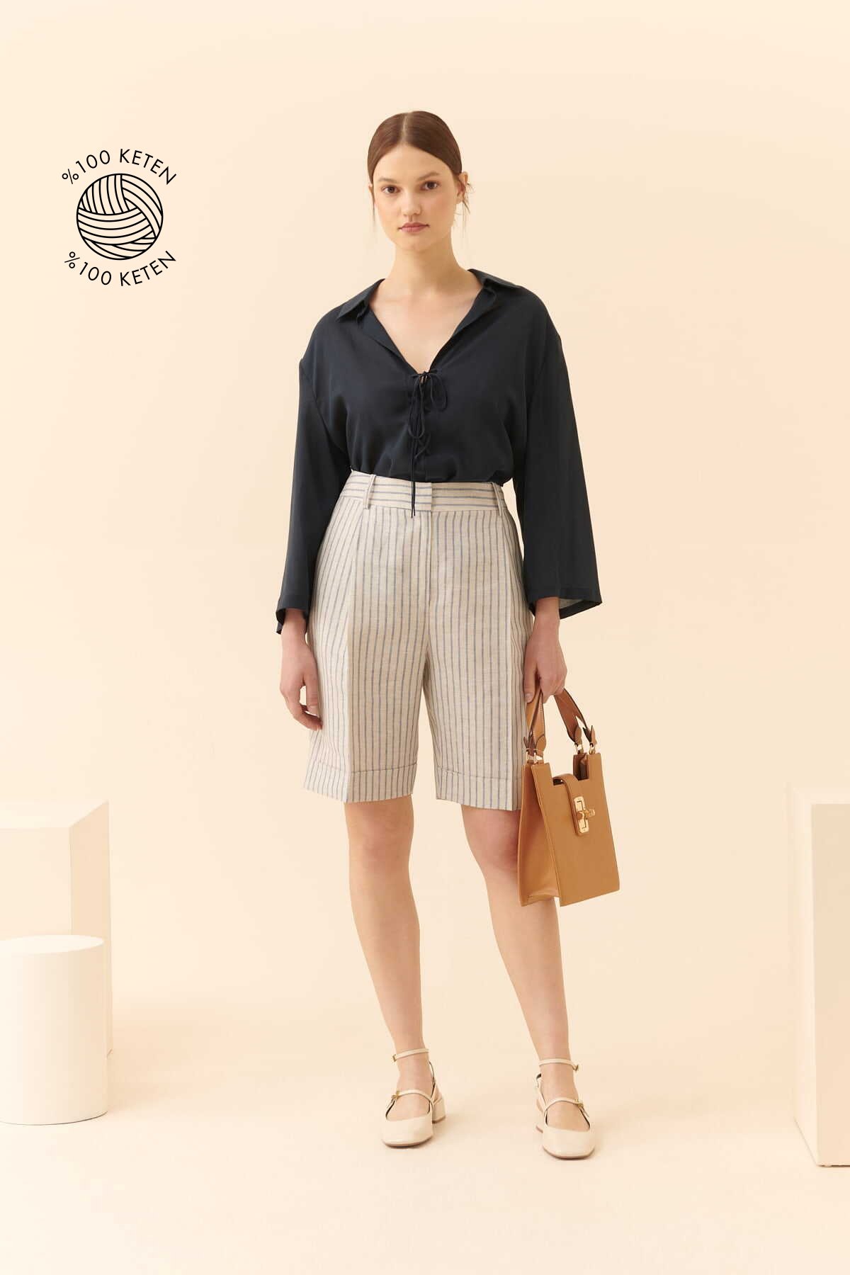 %100 Keten Kruvaze Görünümlü Cepli Şort Etek Haki