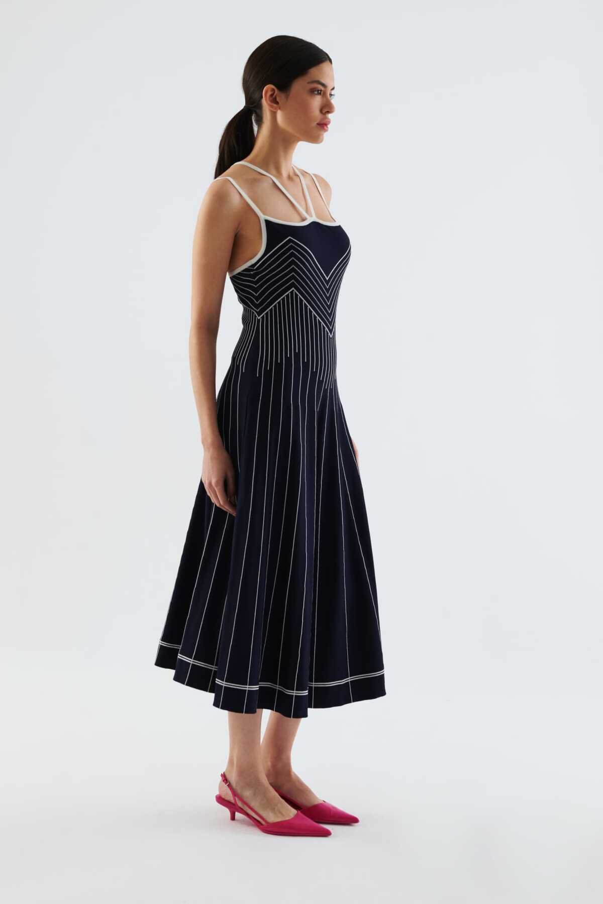 Drape Detaylı Kayık Yaka Midi Boy Tafta Elbise Lacivert