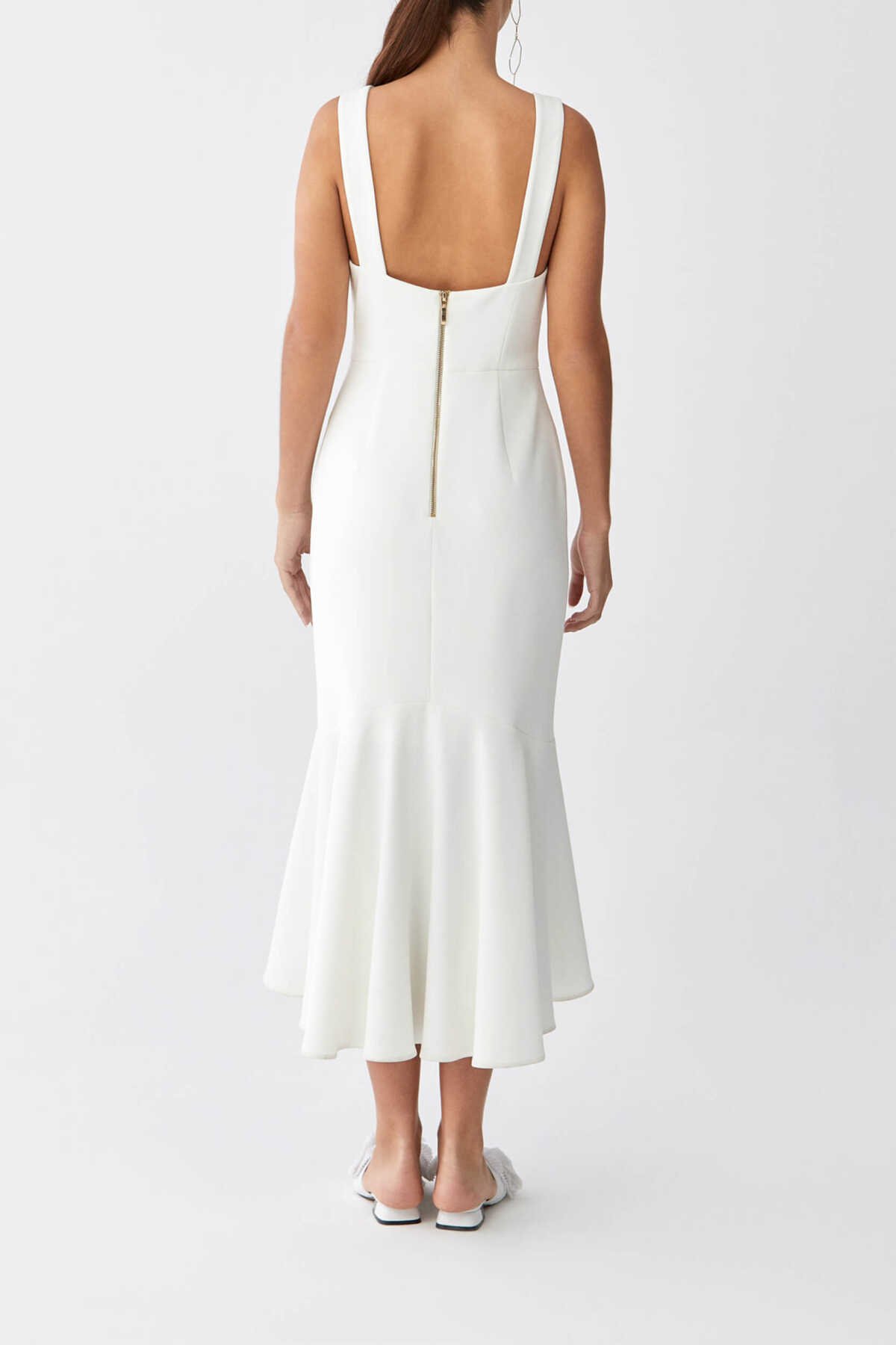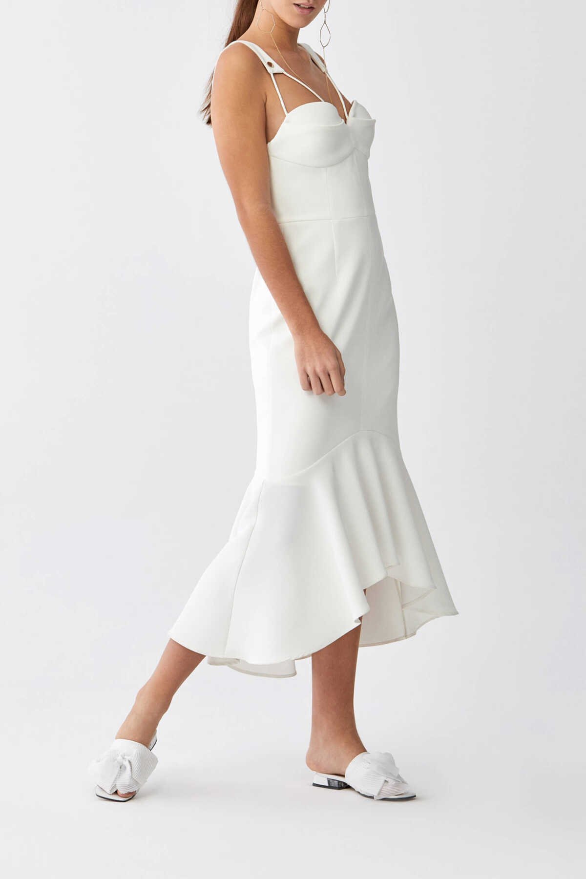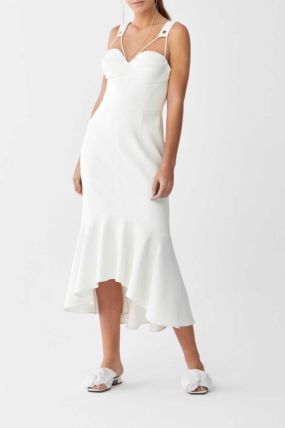 Askılı Gögüs Detaylı Etekleri Volanlı Abiye Elbise Beyaz