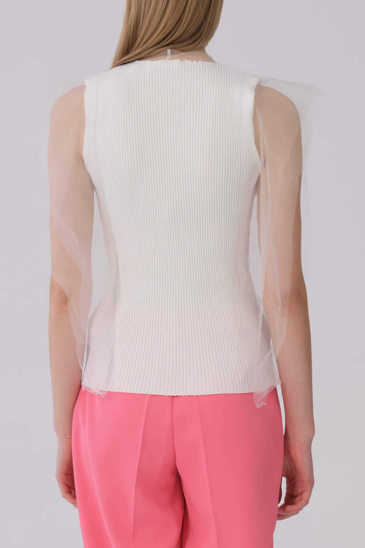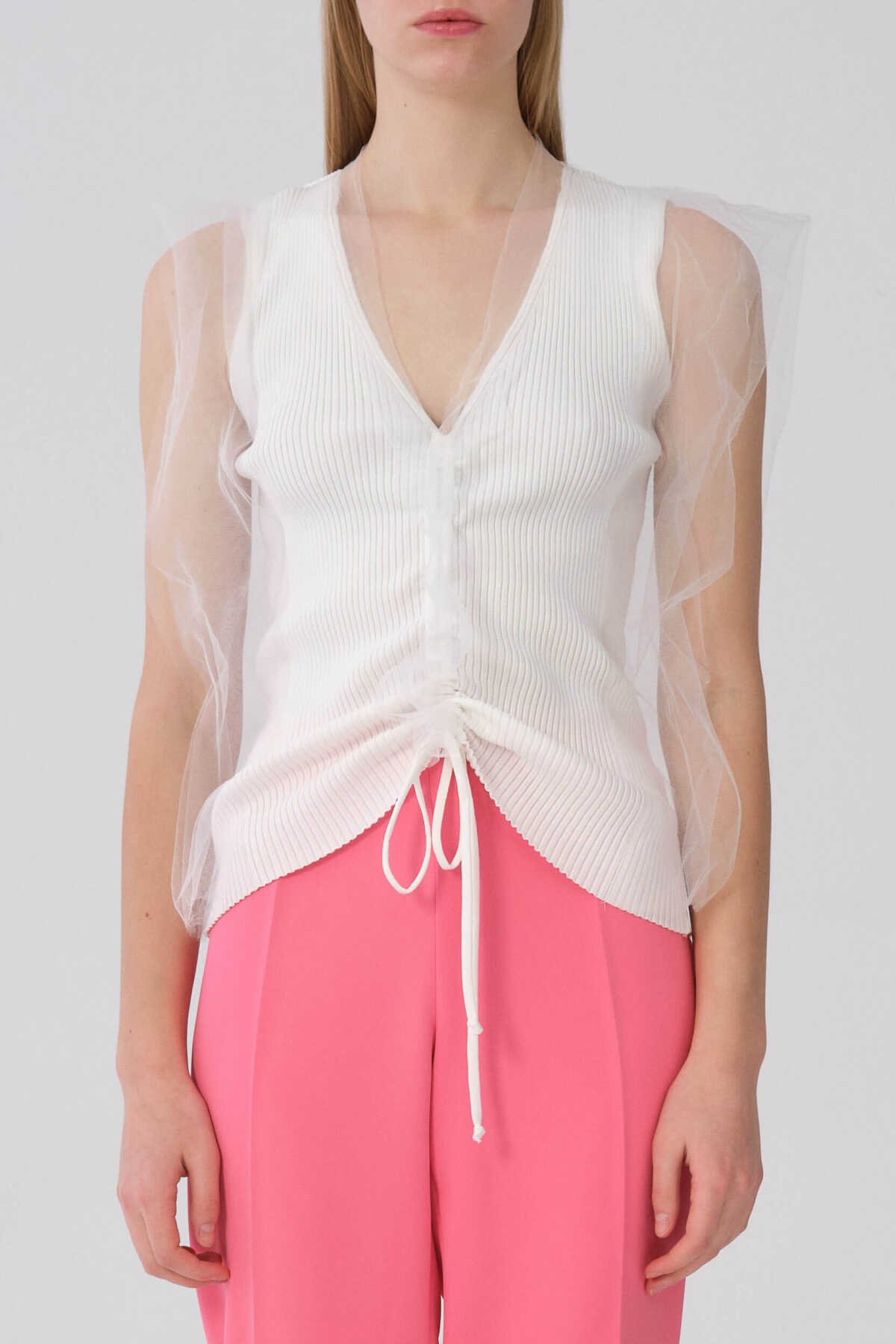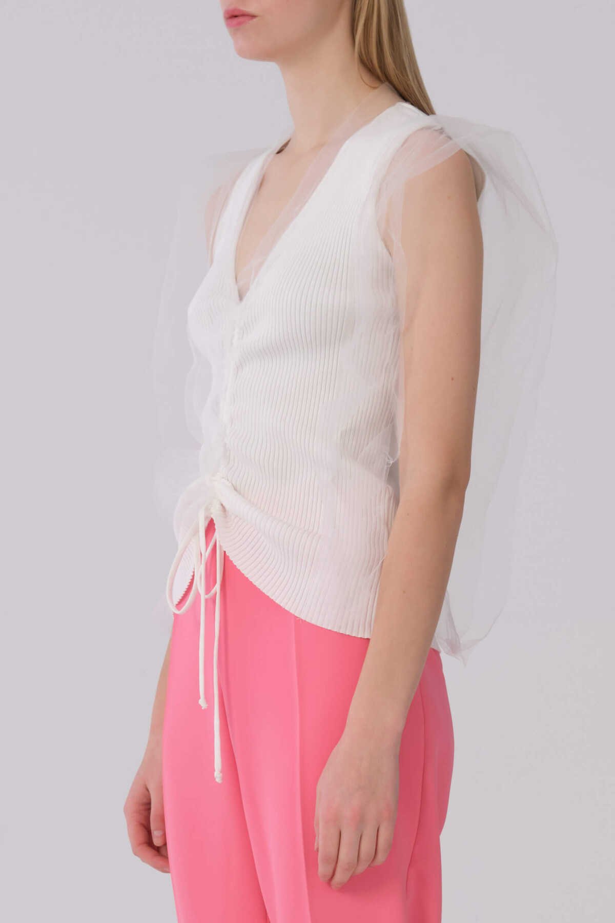Askılı Önü Büzgülü Tül Detaylı Triko Ekru