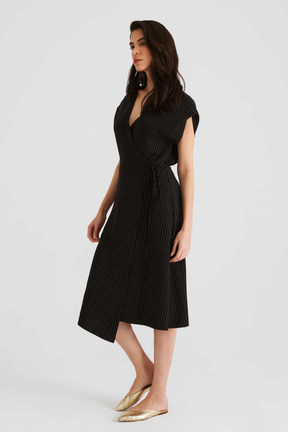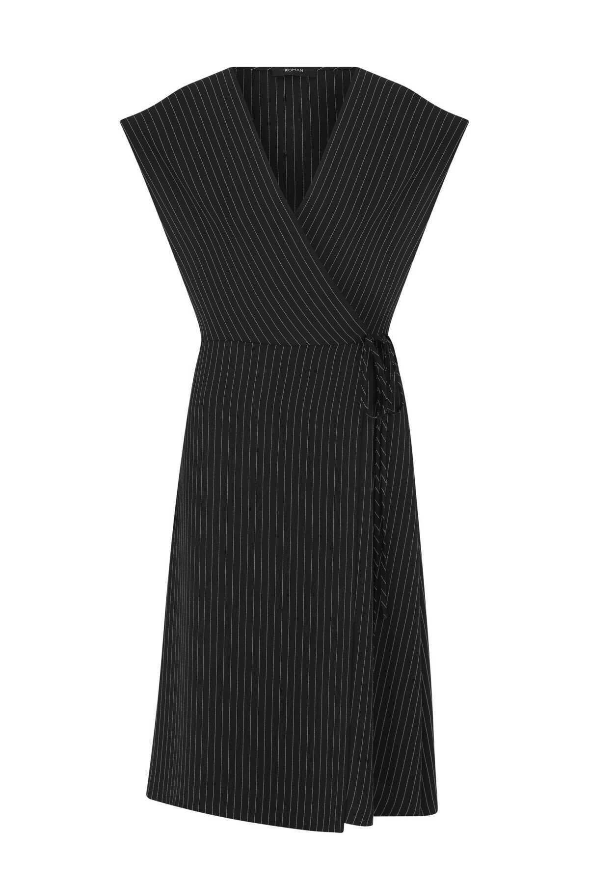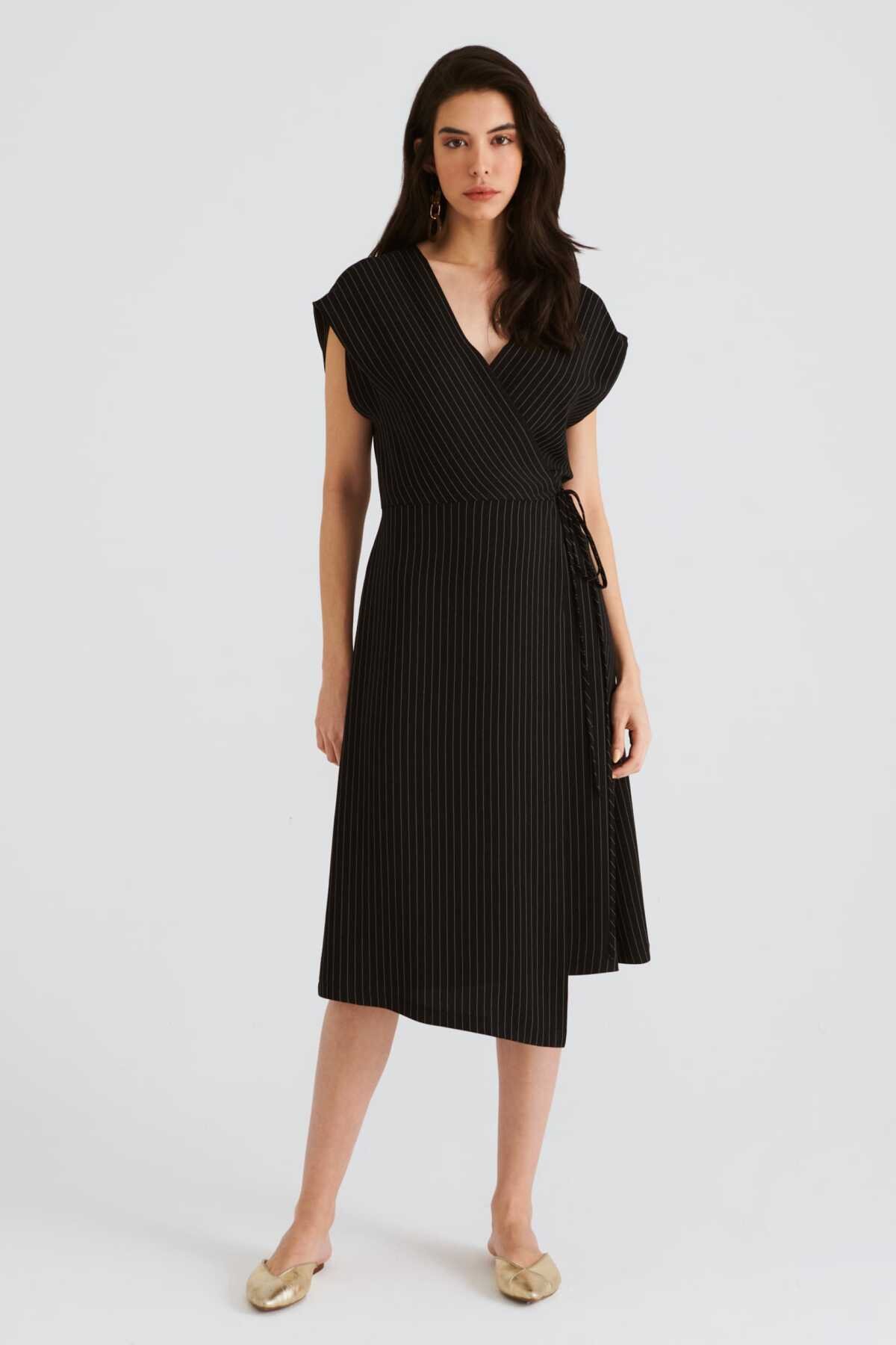 Belden Bağlamalı V Yaka Çizgili Günlük Elbise Siyah-Beyaz