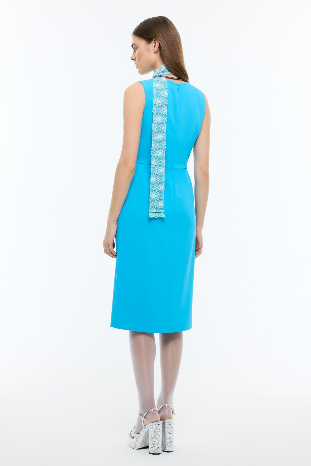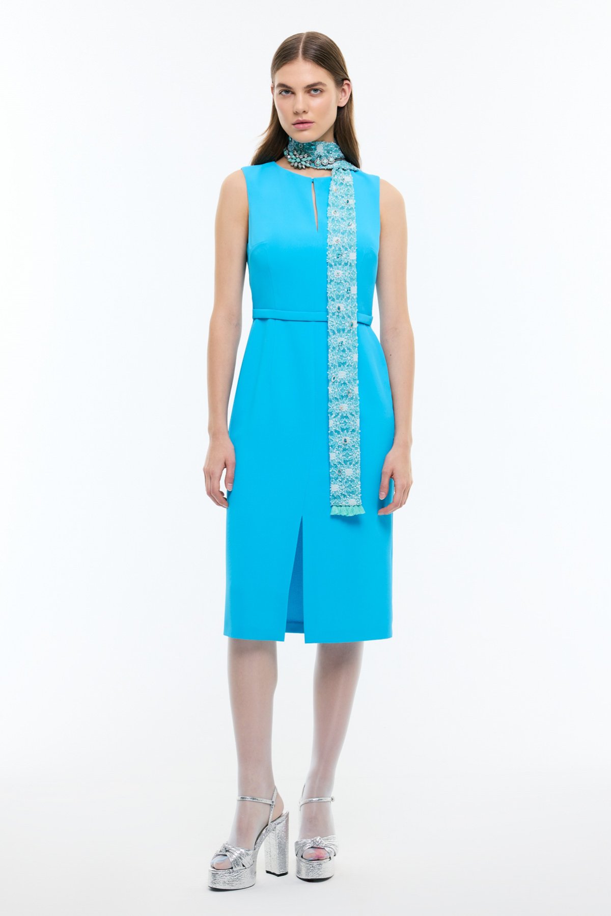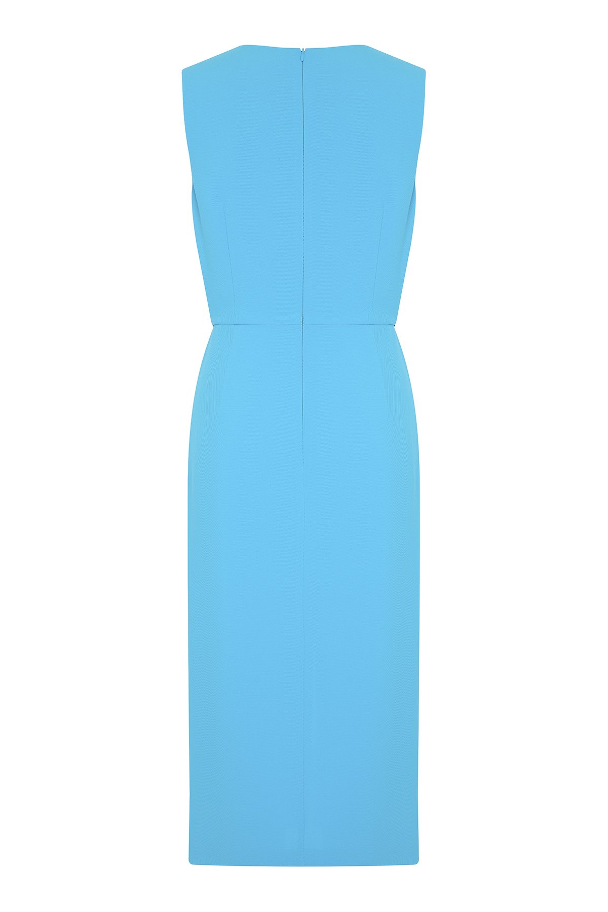 Bele Oturan Şerit ve Yırtmaç Detaylı Midi Boy Elbise Mavi - 4