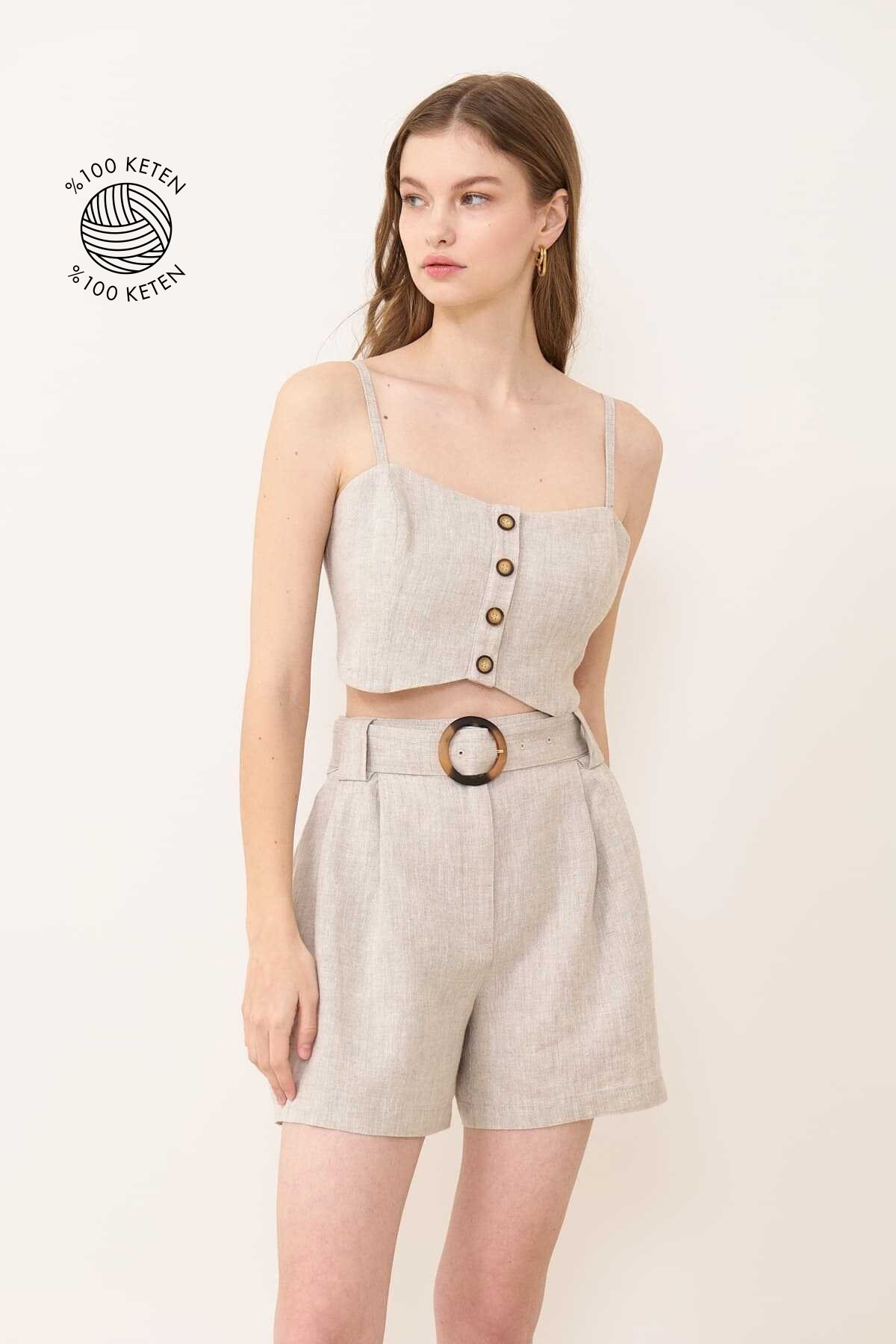 Düğme Detaylı İnce Askılı Crop Keten Büstiyer Naturel