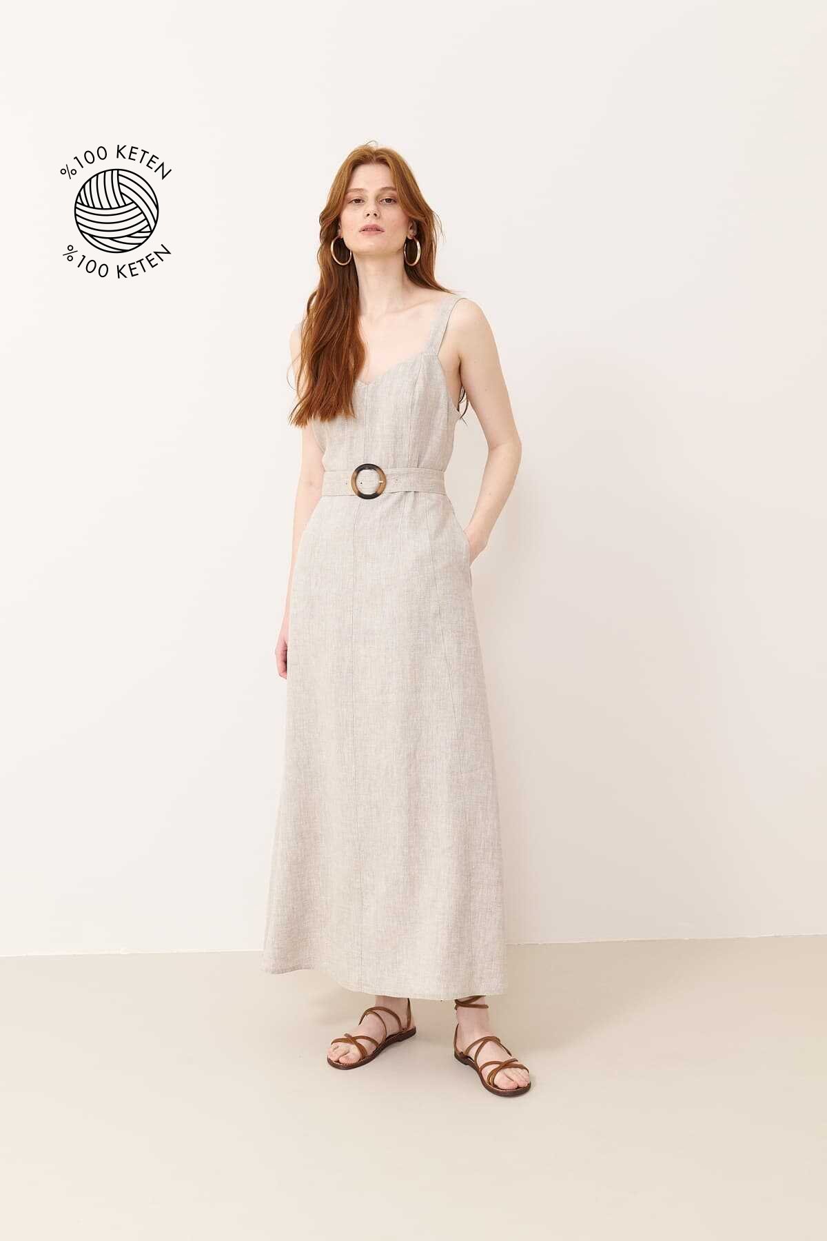 Beli kemerli V yaka kalın askılı keten midi elbise MODEL ÖLÇÜLERİ: Beden: 36 Boy: 177-178 cm Göğüs: 80-84 cm Bel: 60-62 cm Kalça: 89-92 cm Model S Beden Giymektedir.