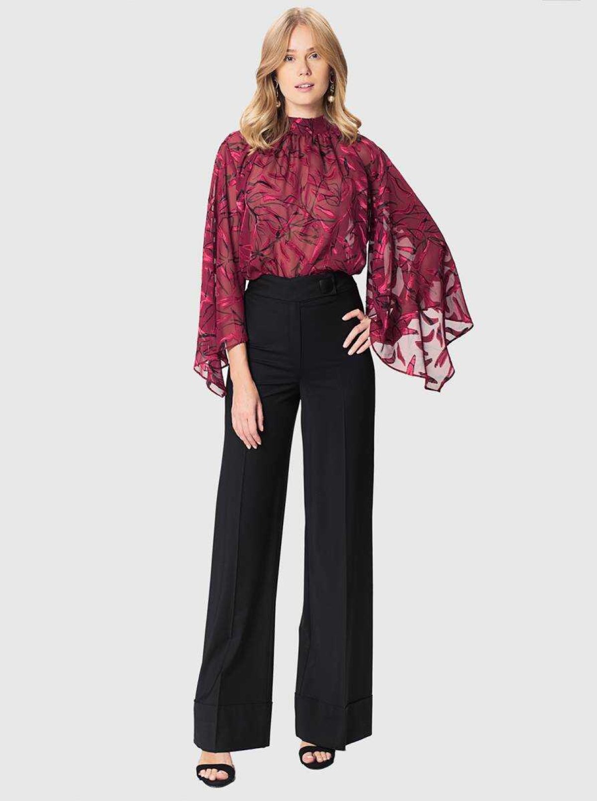 Nakış Detaylı Beli Lastikli Geniş Paça Pantolon Bordo