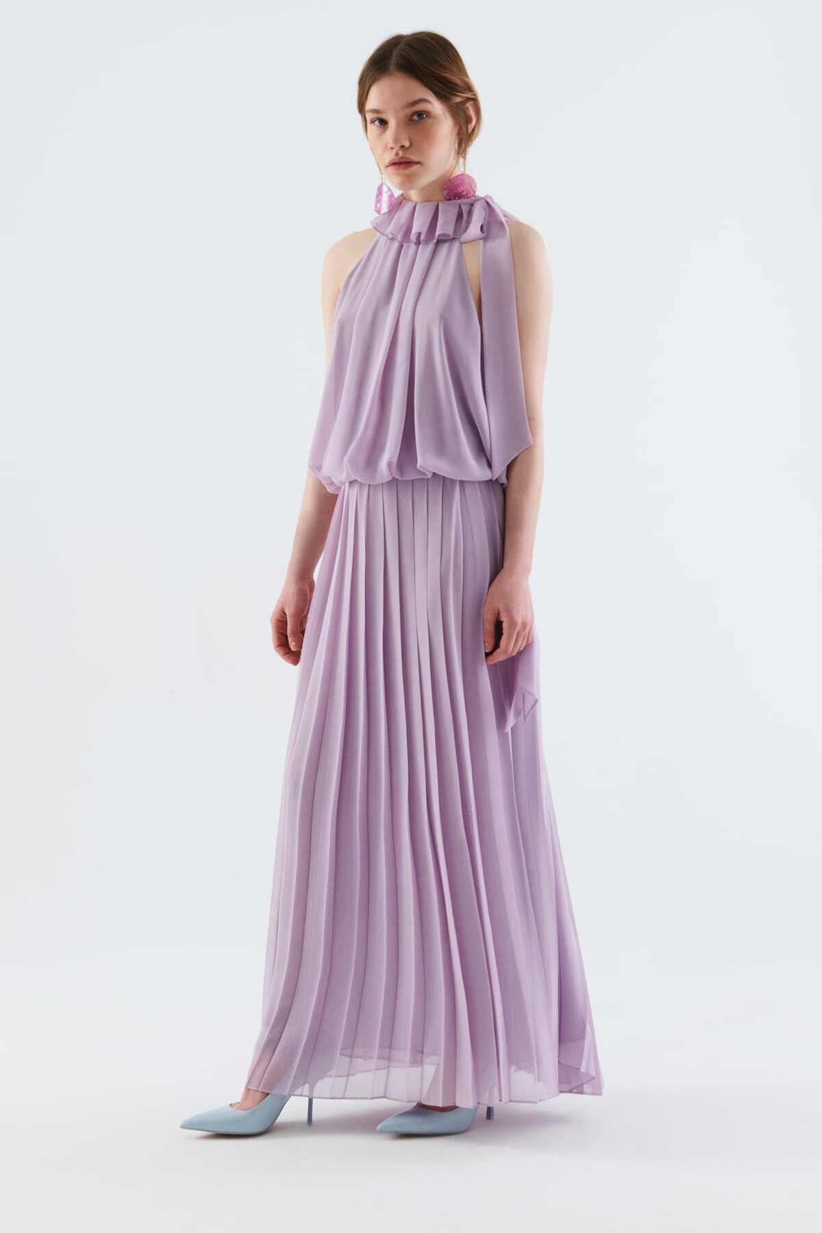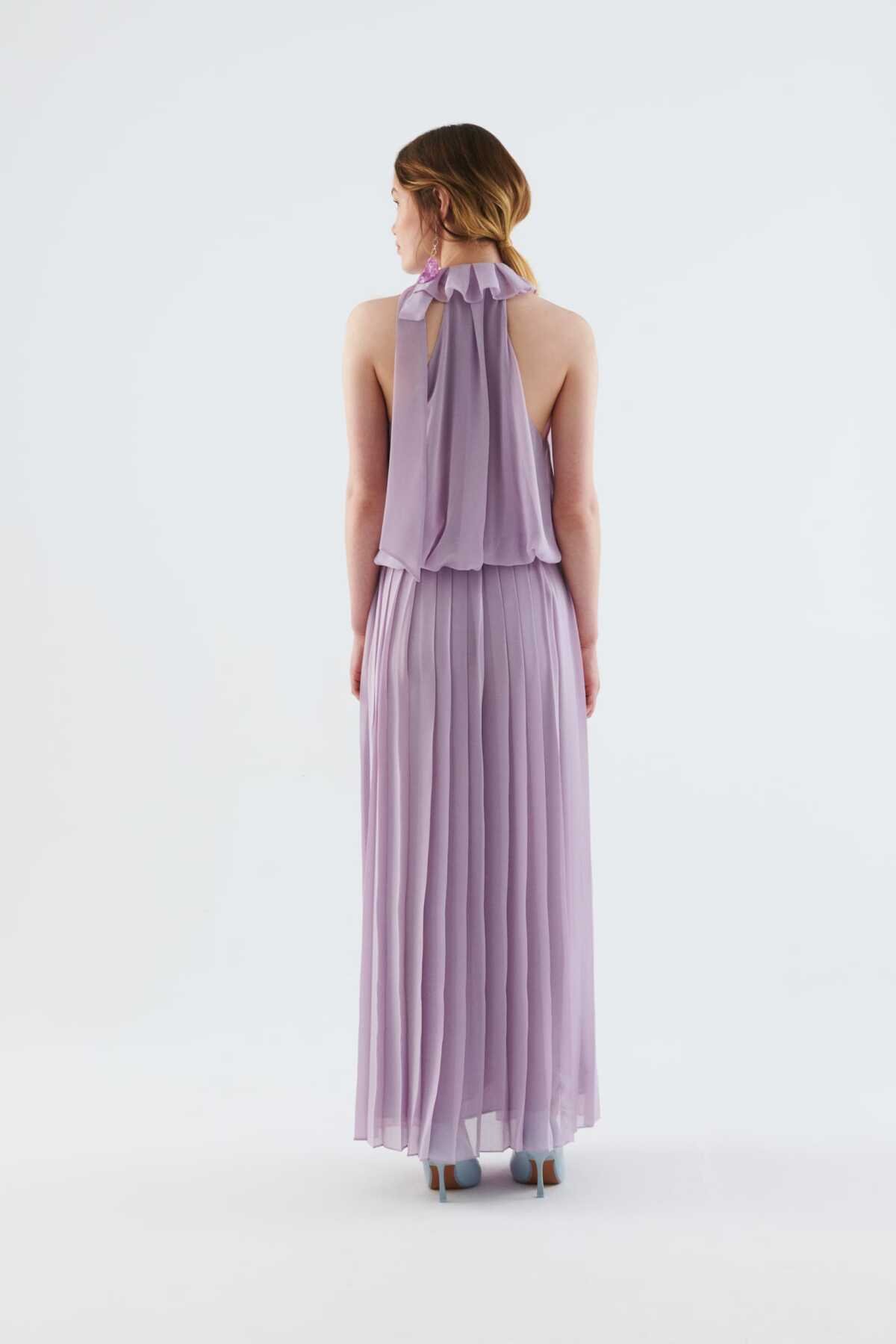 Omuzları Çiçek Aksesuarlı Pileli Midi Boy Elbise Siyah