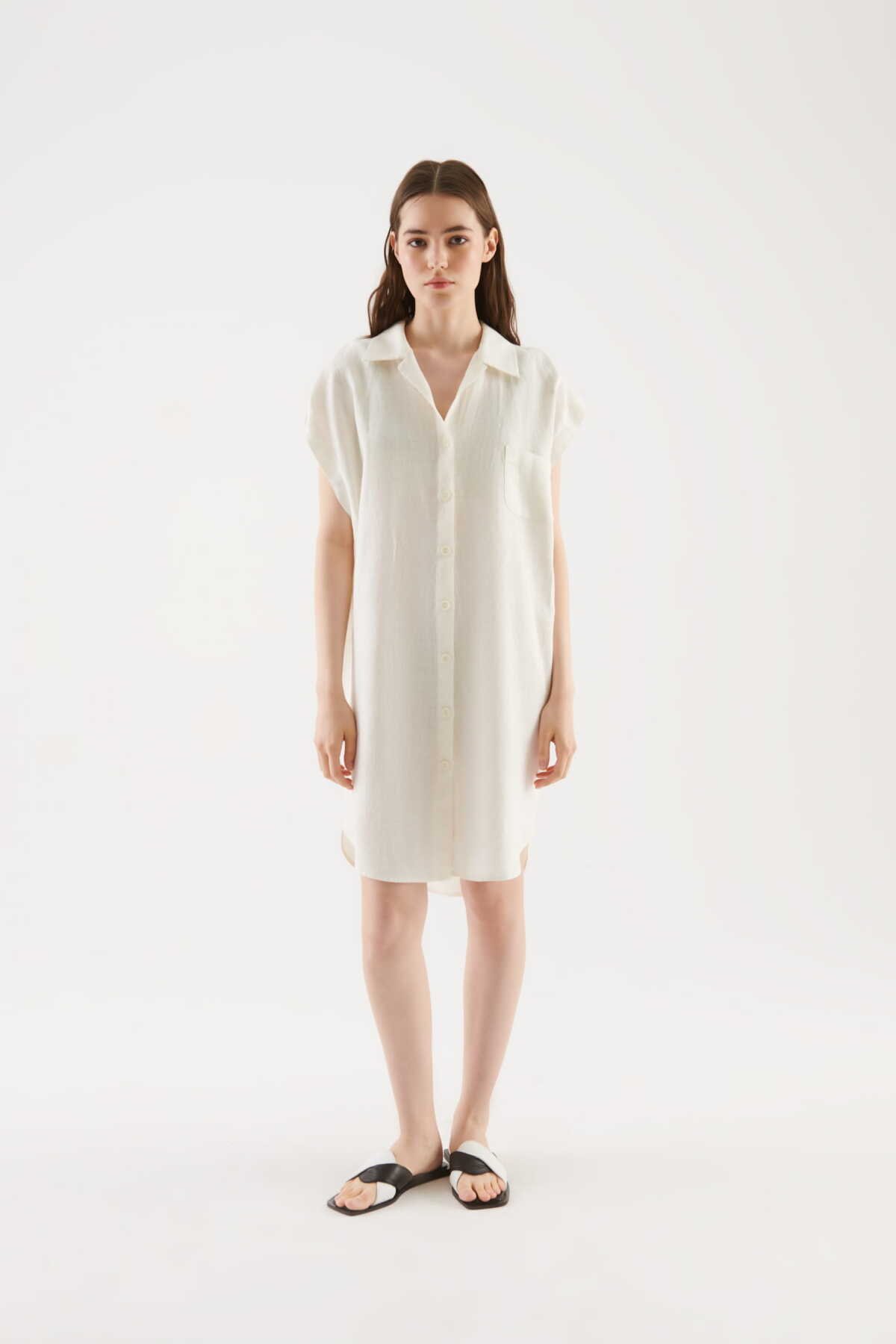 Arka Eteği Pili Detaylı Önden Vatkalı Midi Boy Elbise Ekru