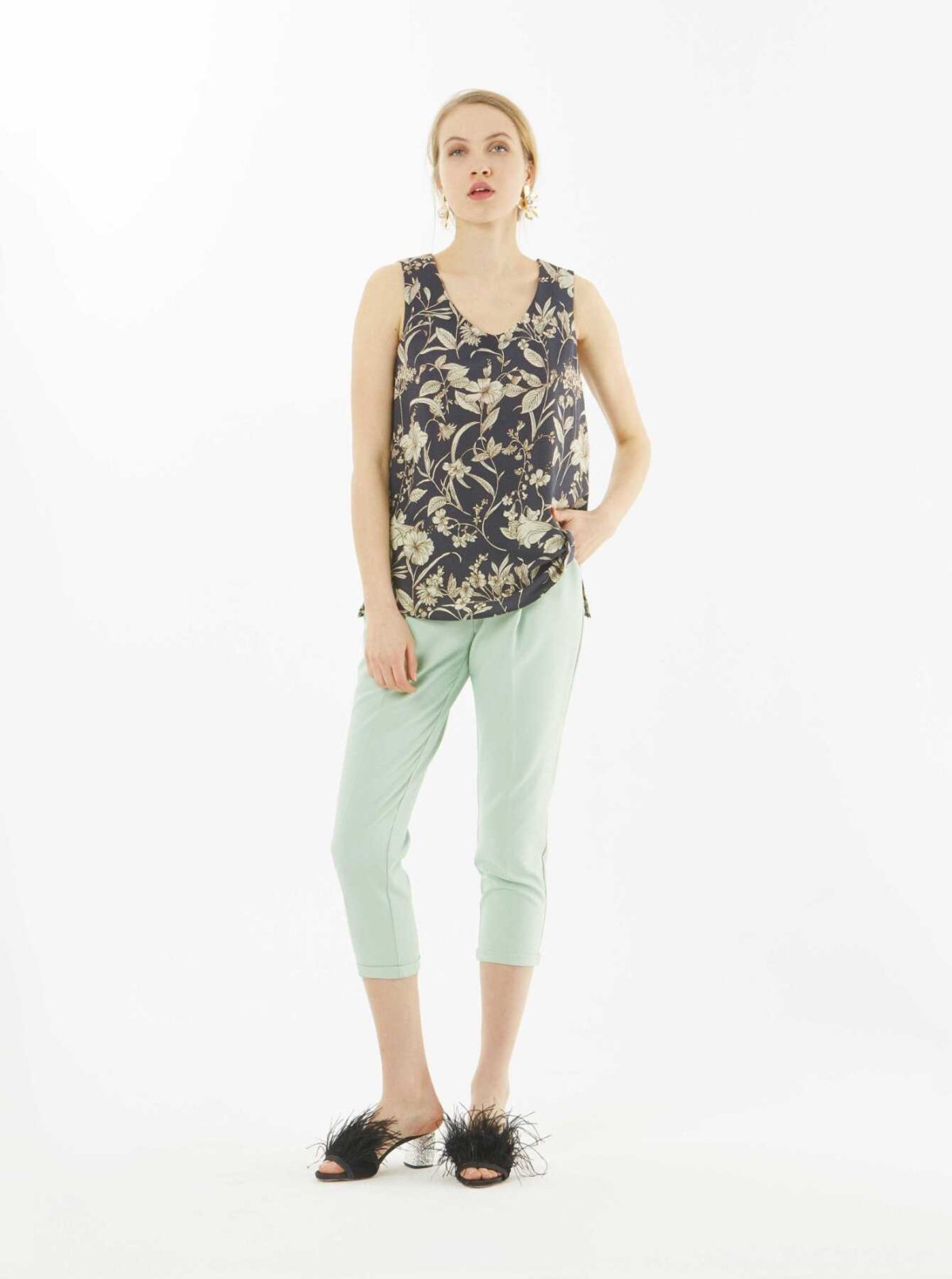 Çiçek Desenli Sıfır Kol Bluz Standart Renk