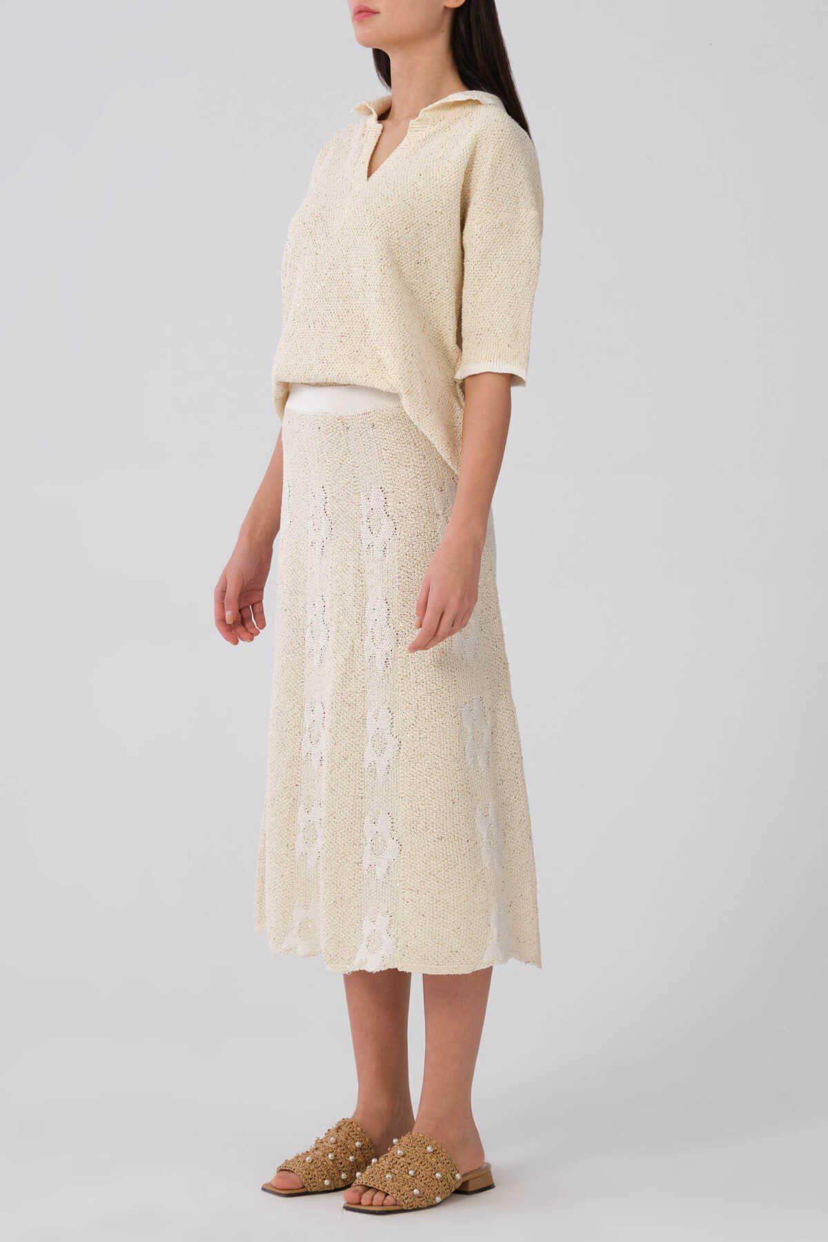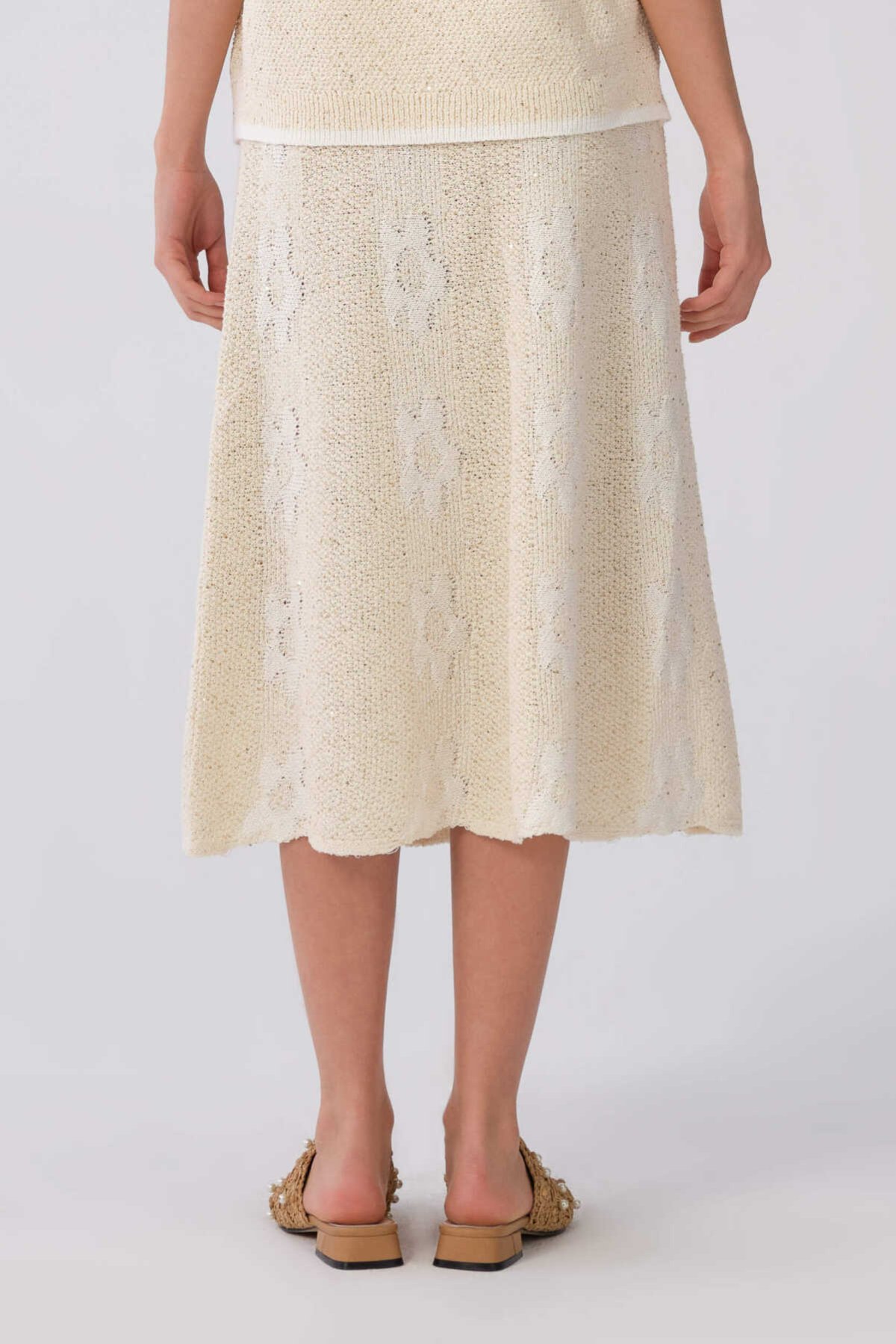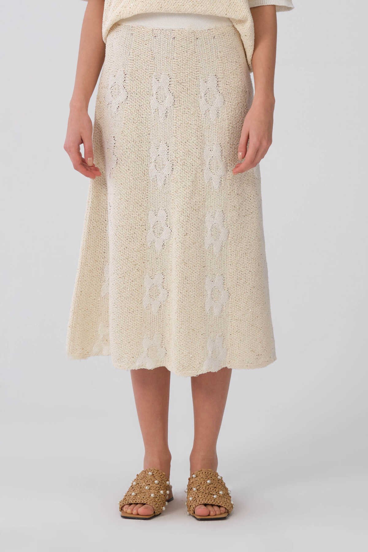 Çiçek Detaylı Naturel Triko Etek Naturel