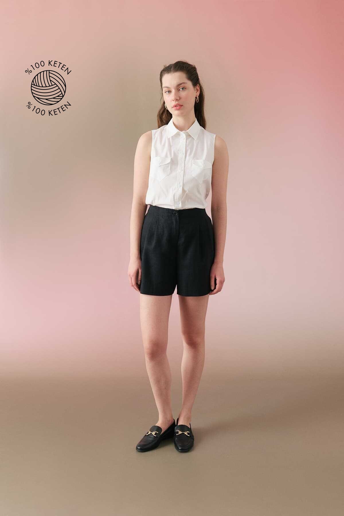 Çift Pileli Keten Şort Siyah