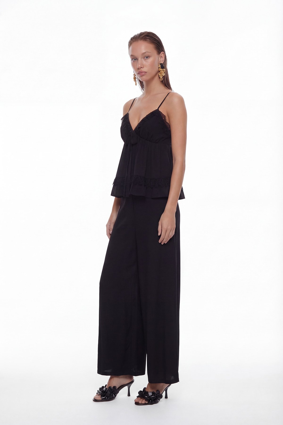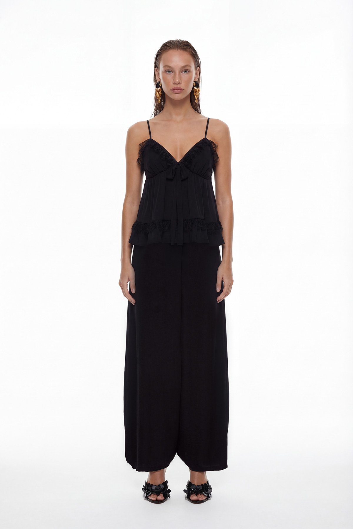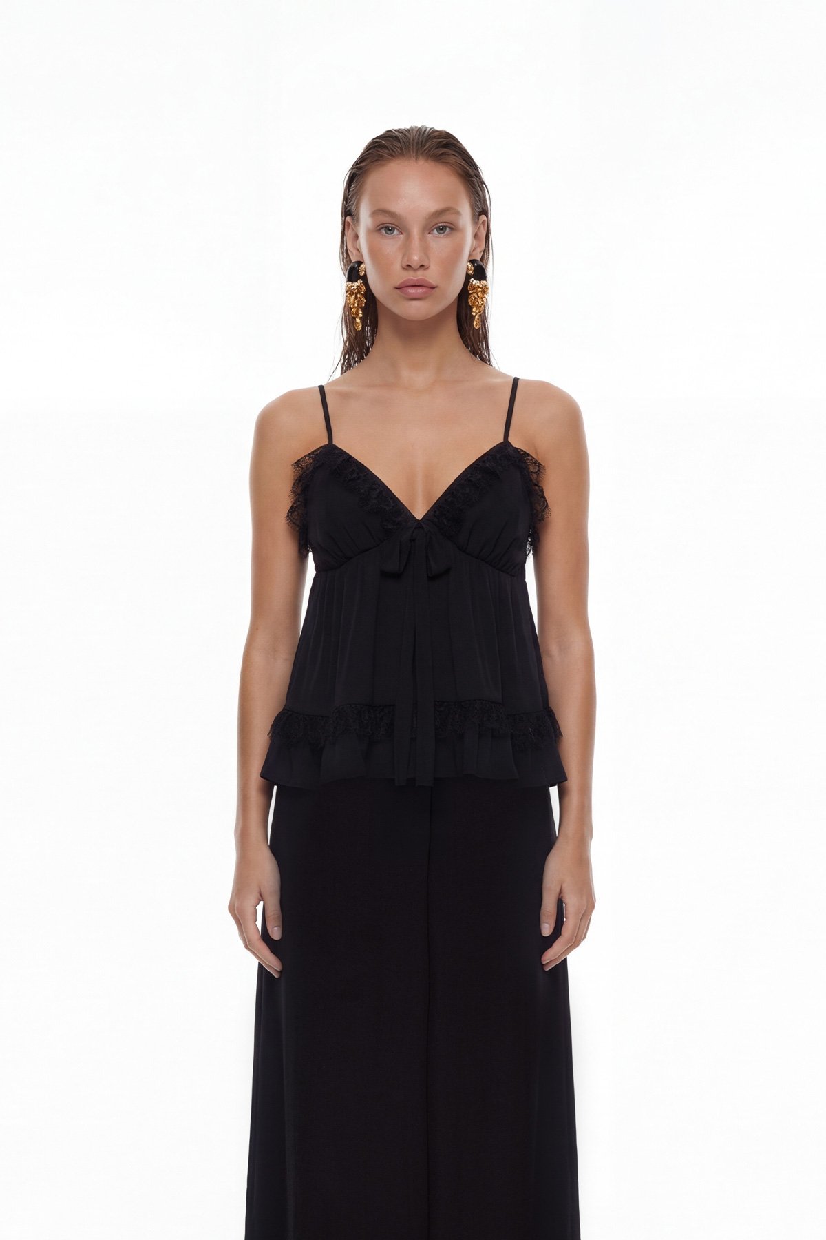 Dantel ve Volan Detaylı İnce Askılı Bluz Siyah
