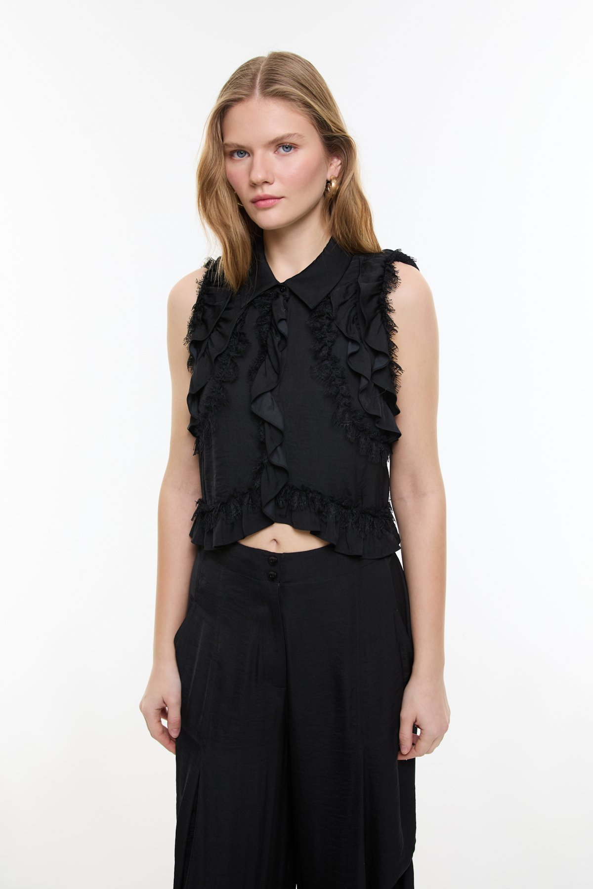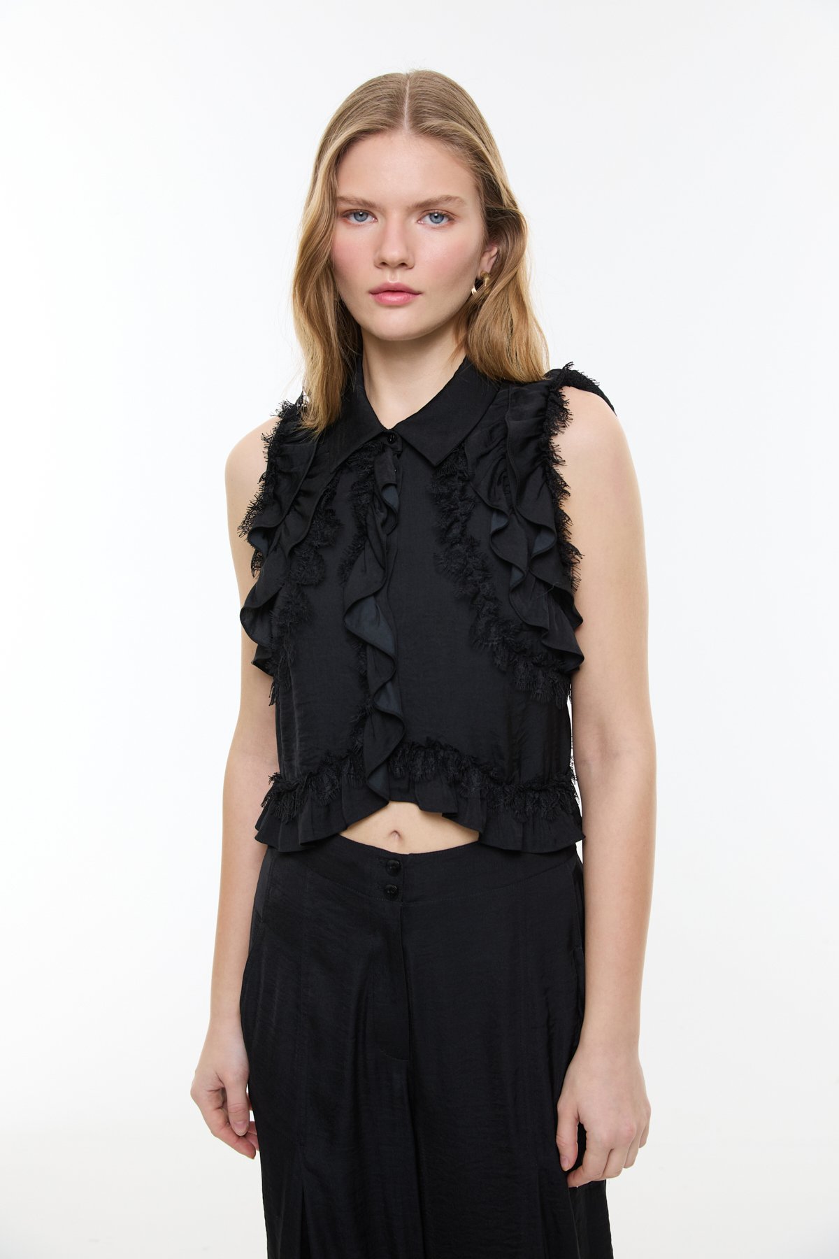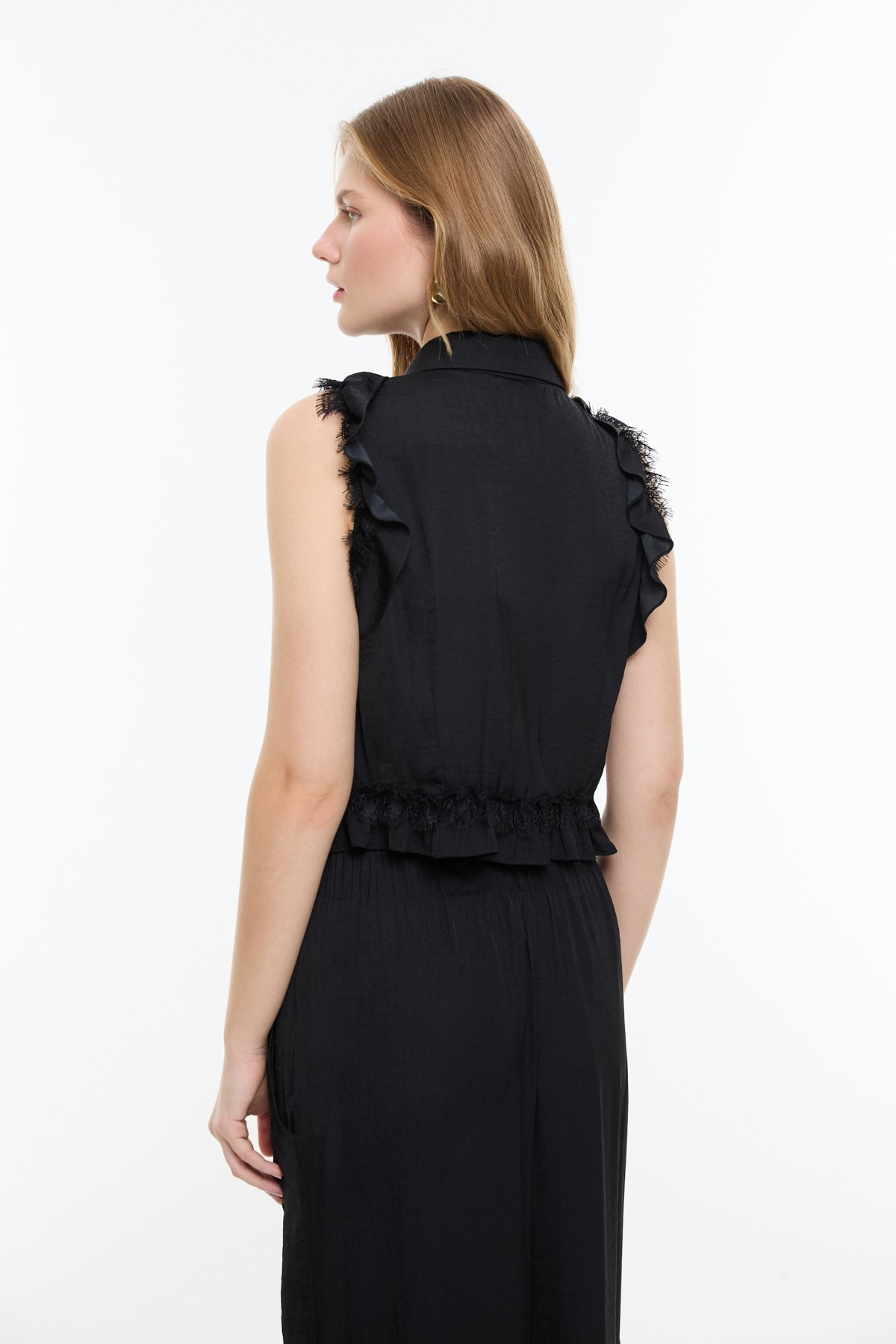 Dantel ve Volan Detaylı Kolsuz Gömlek Siyah