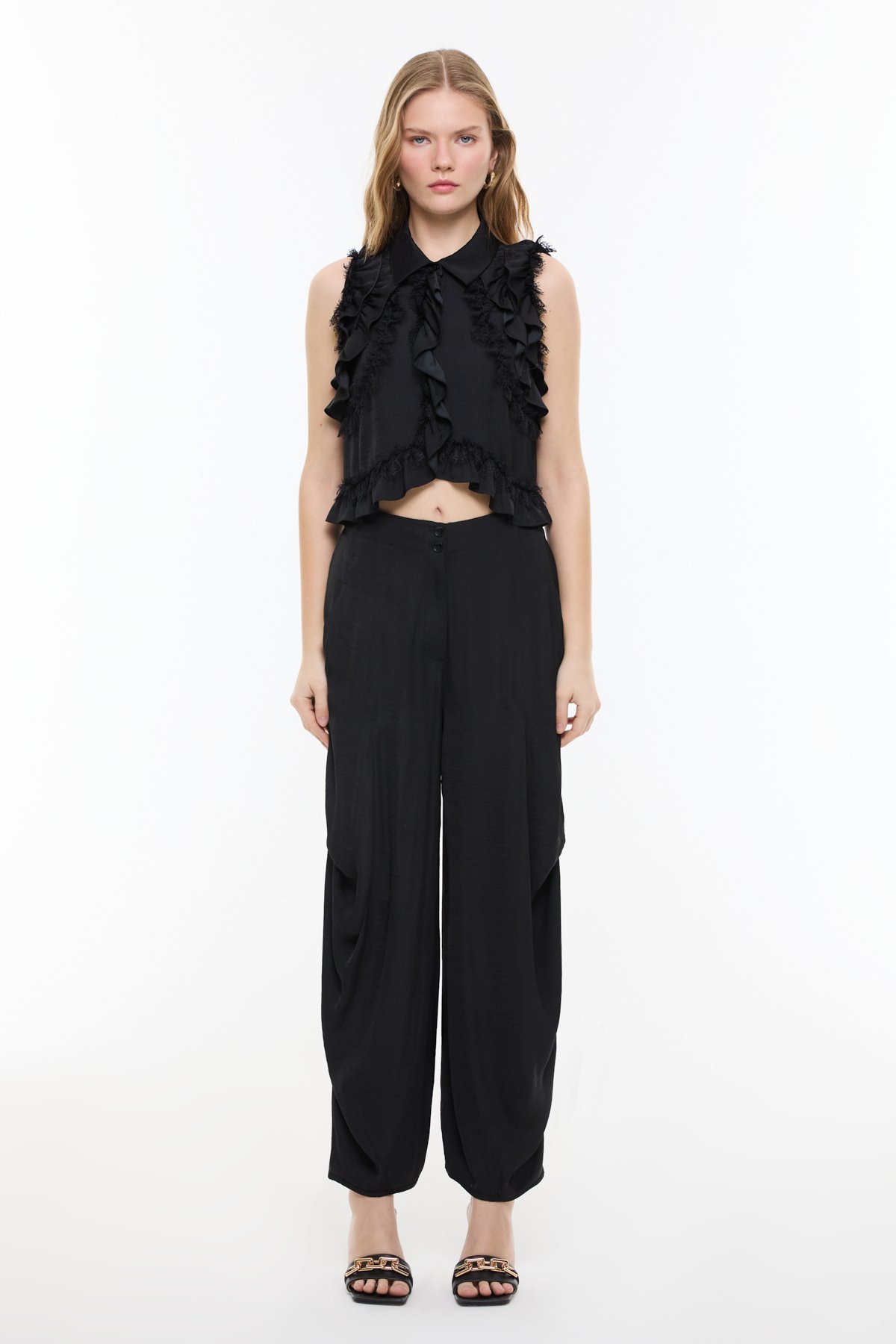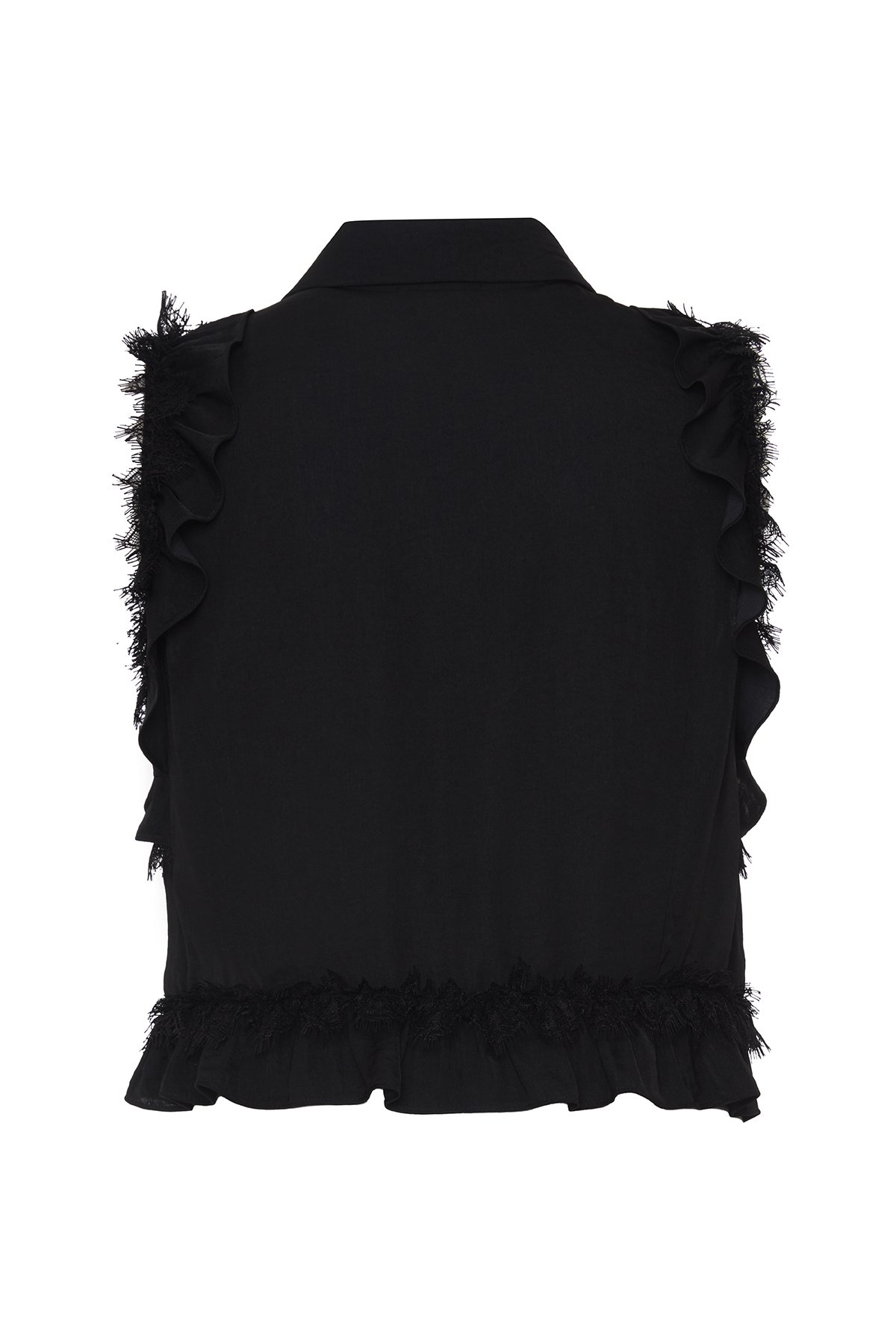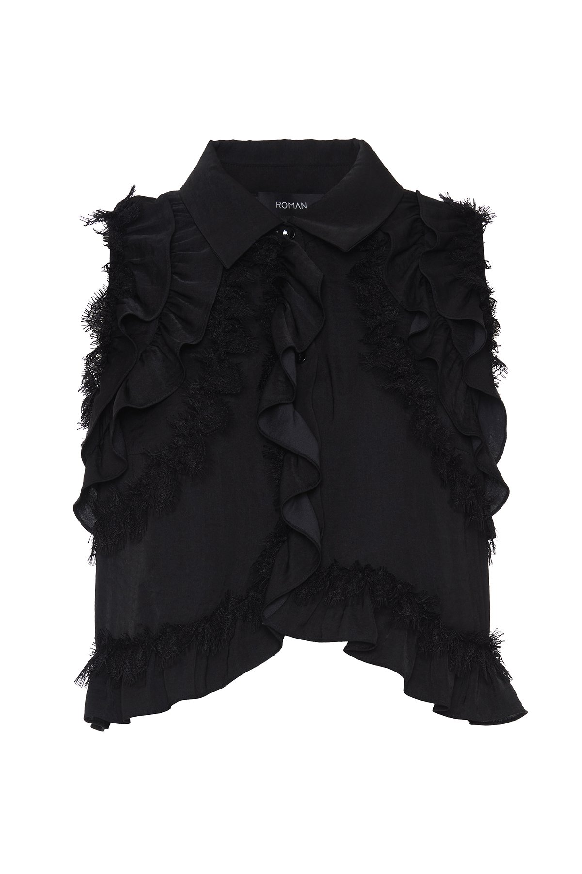 Dantel ve Volan Detaylı Kolsuz Gömlek Siyah