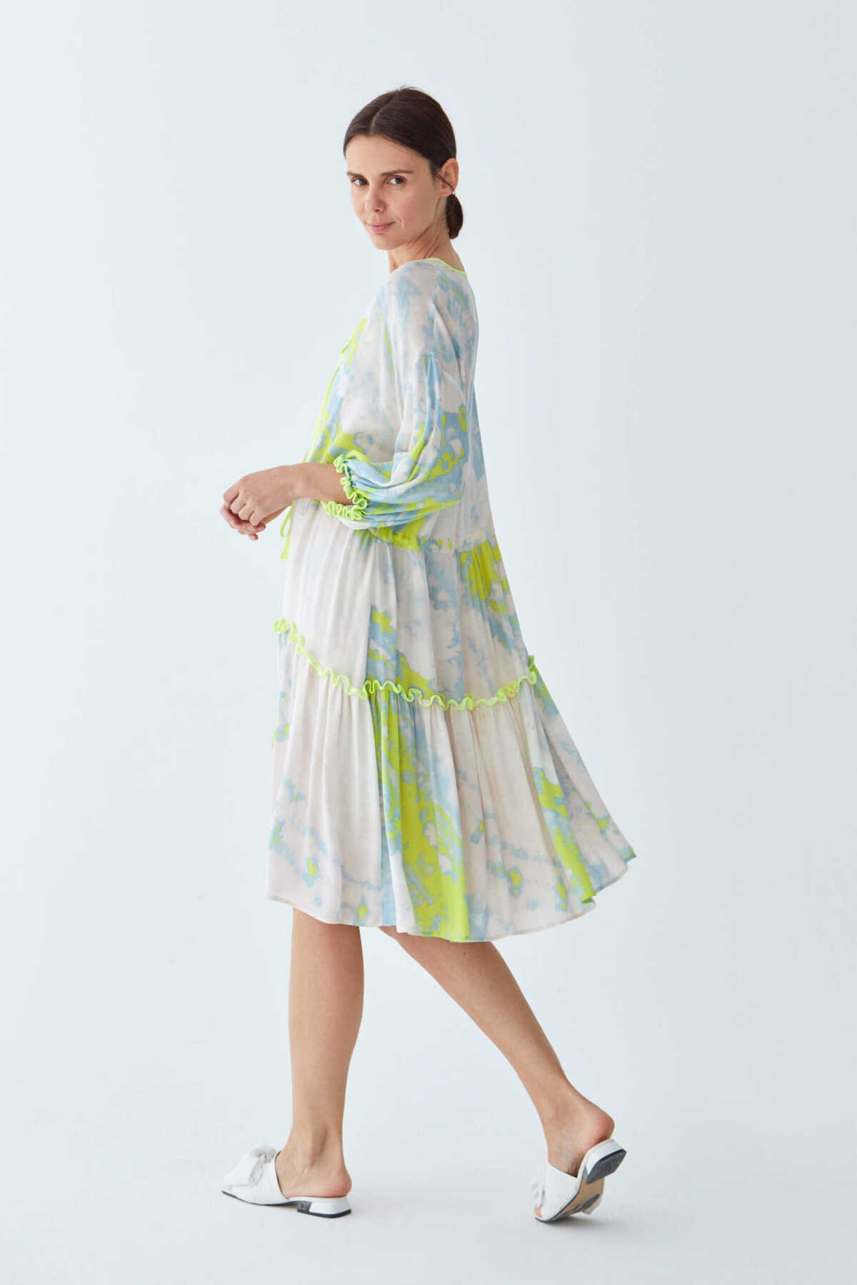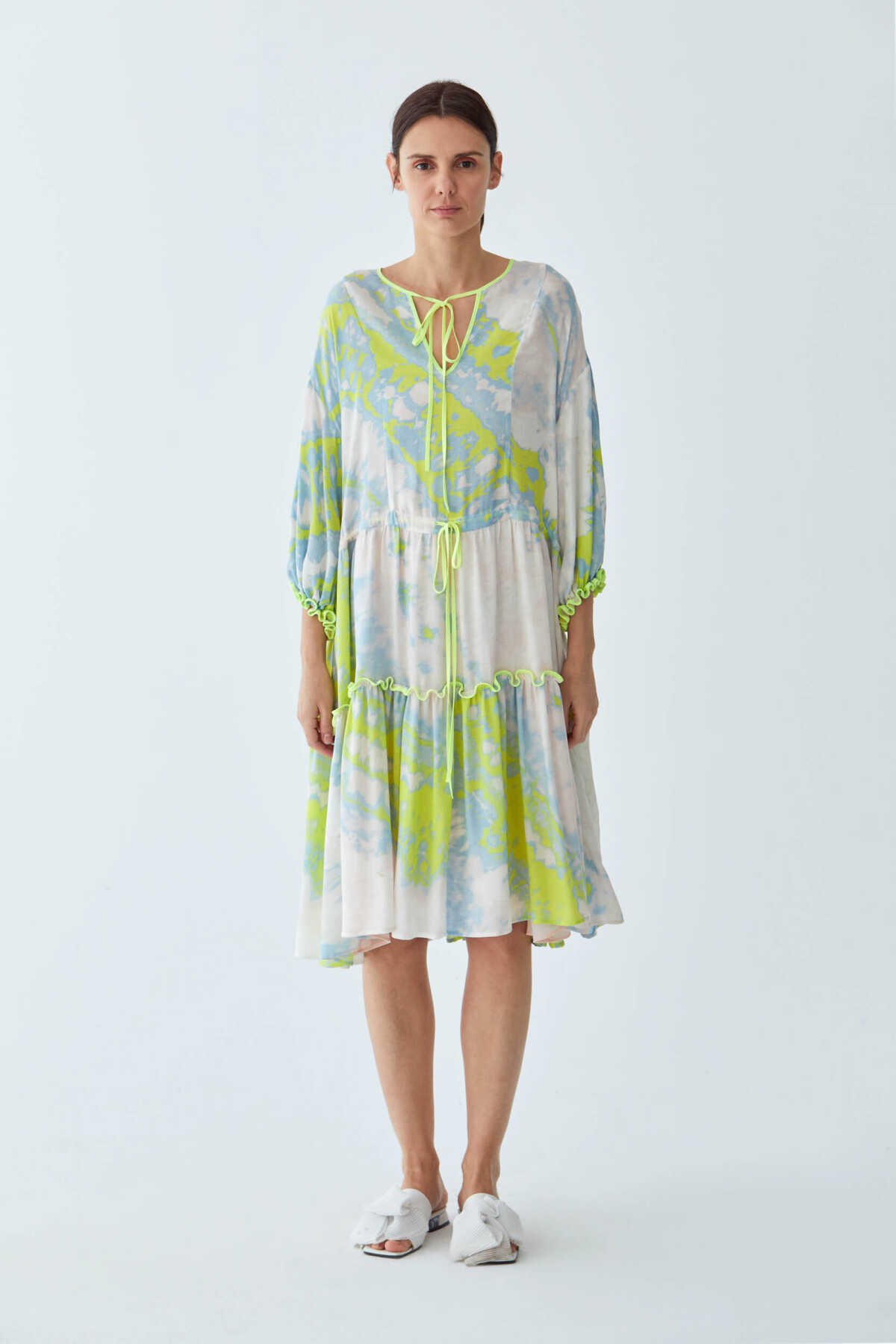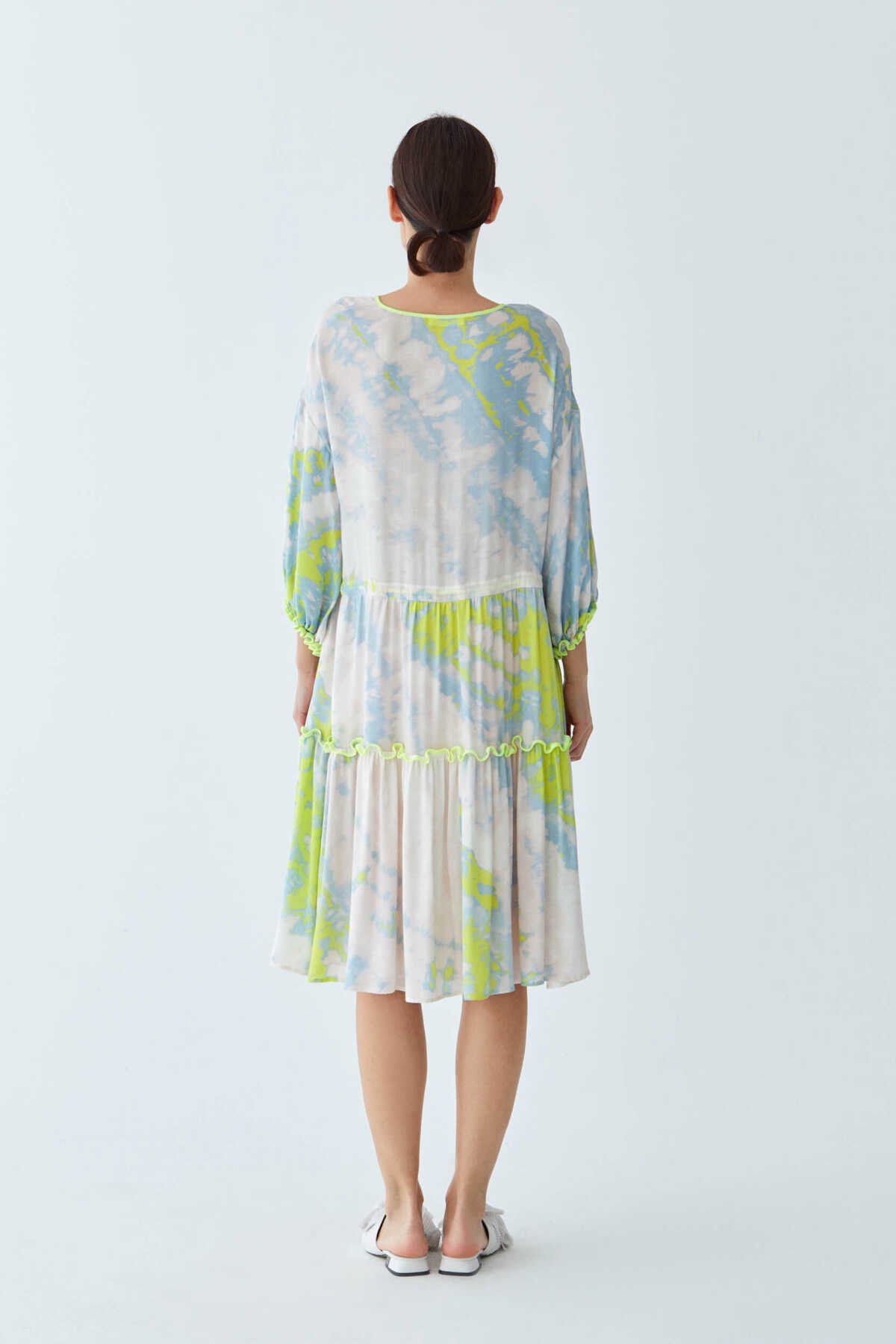 KUMAŞ İÇERİĞİ: Garni 1: %100 Polyester ,Astar 1: %100 Polyester ,Ana Kumaş: %100 Viskon , YIKAMA TALİMATI: Yıkama Yapılmaz ÜTÜLEME TALİMATI: Orta Isıda Ütüleme 150C KURUTMA TALİMATI: Tamburlu Kurutma Yapılmaz ALT ÜRÜN GRUBU: Balon kollu MODEL ÖLÇÜLERİ: