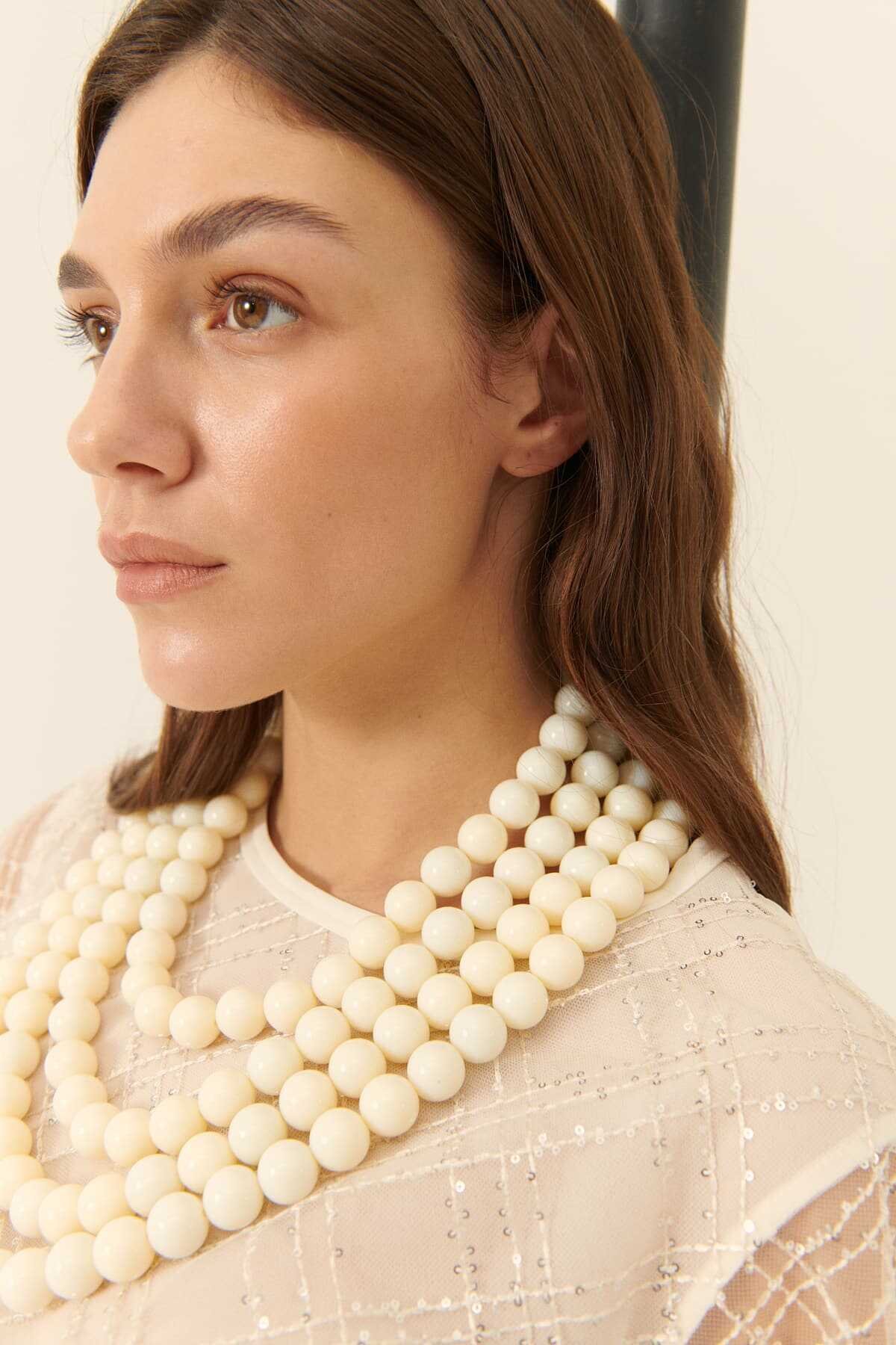 İnci Detaylı Uzun Zincir Kolye Pudra