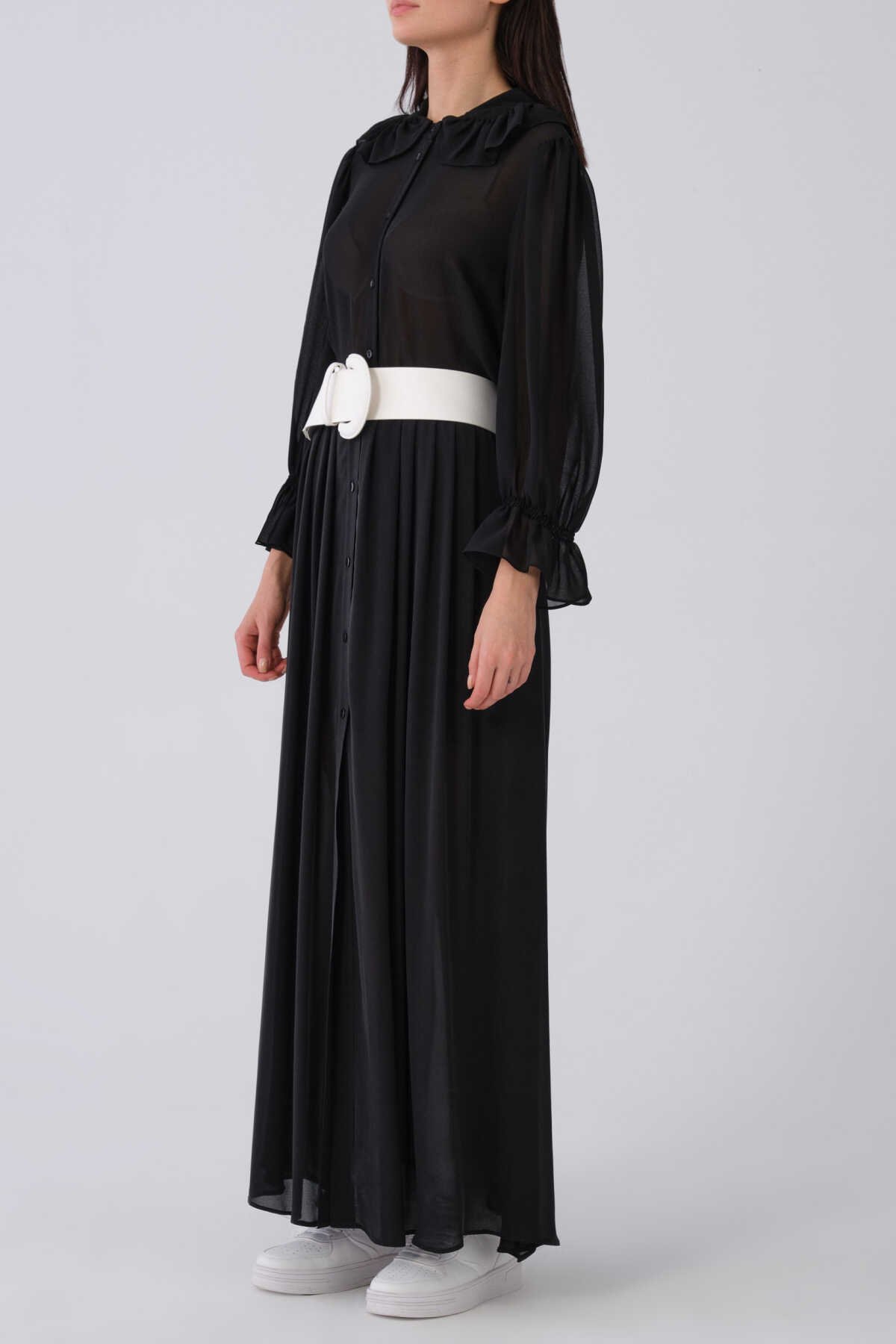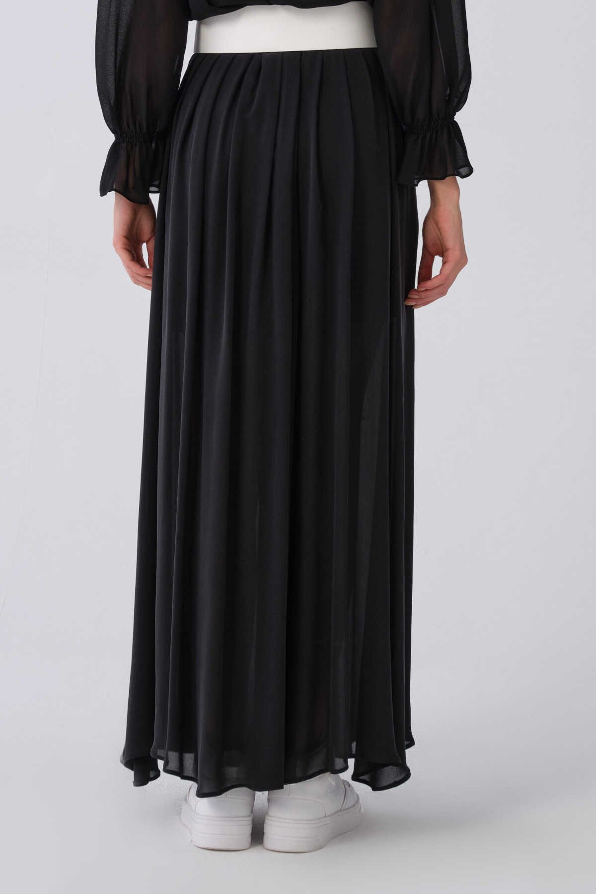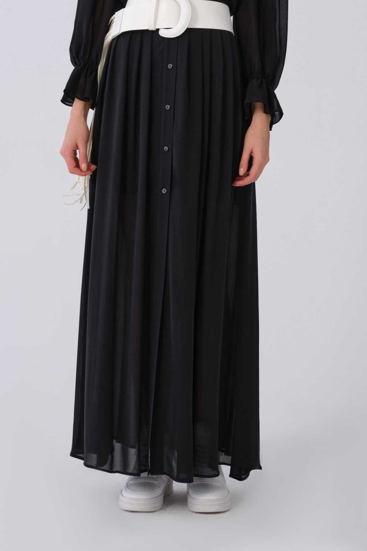 Düğme Detaylı Şifon Uzun Etek Siyah