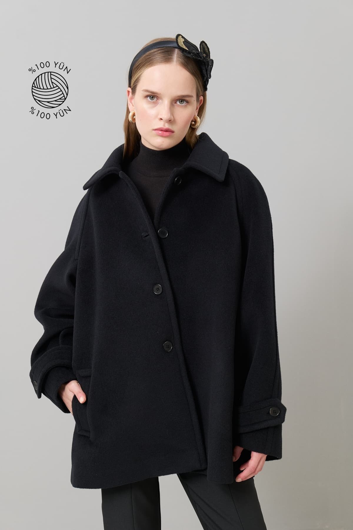 Düğmeli %100 Yün Kaban Siyah