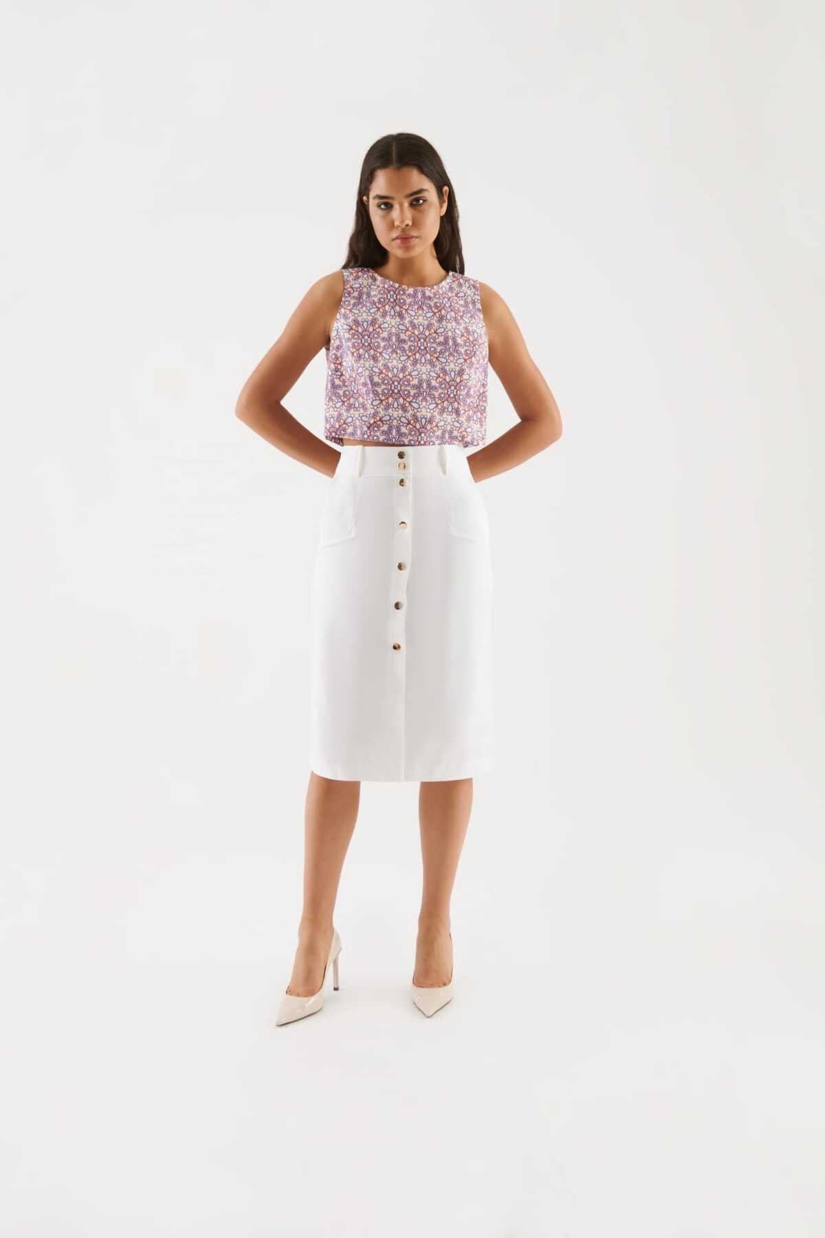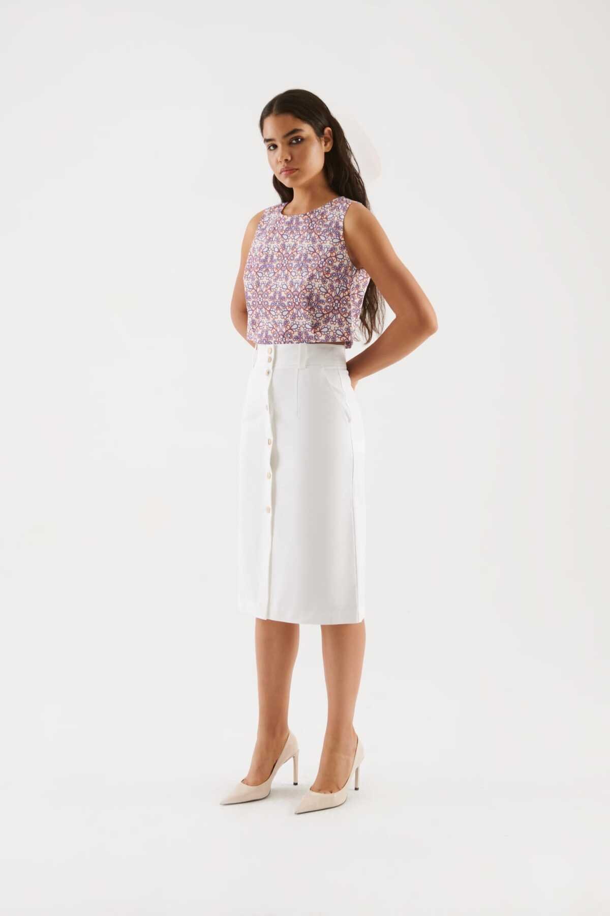 Düğmeli Uzun Etek Beyaz