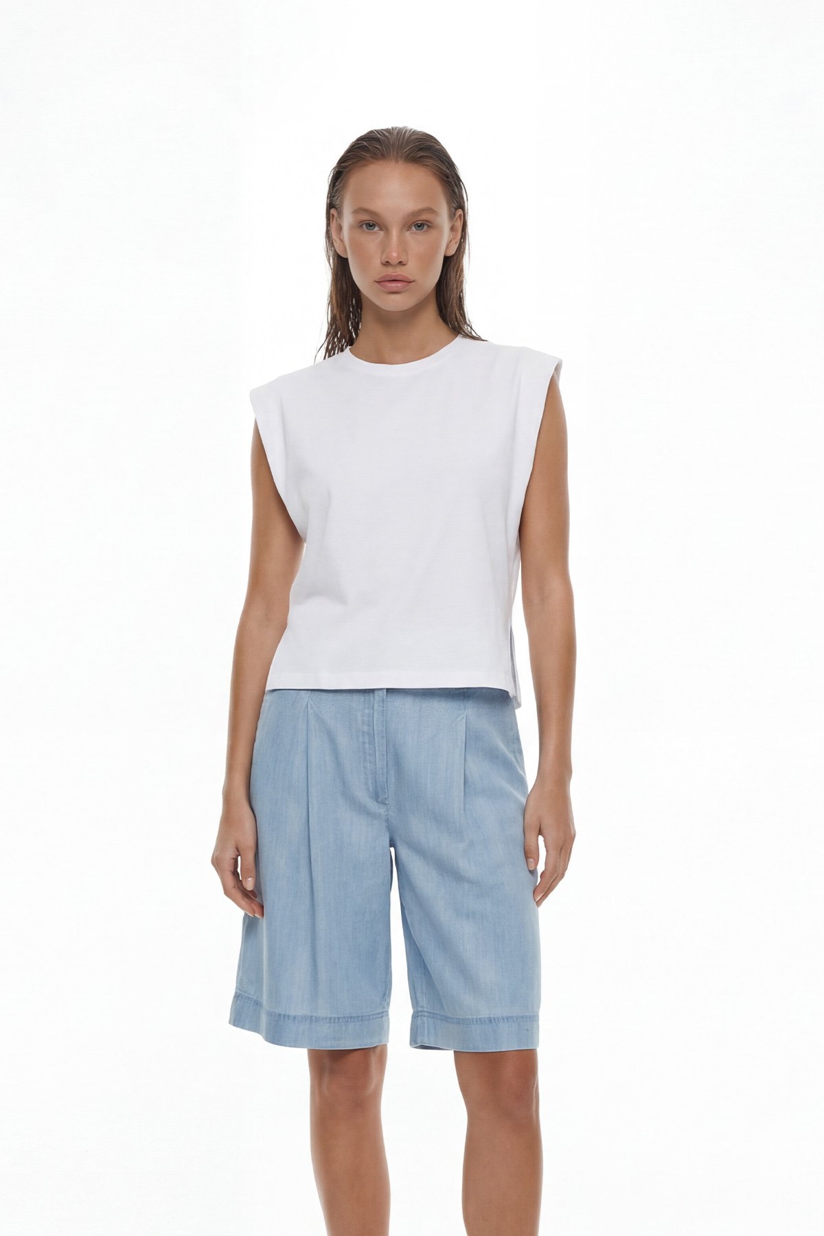 Düşük Omuz Ribana Yakalı Örme T-shirt Beyaz