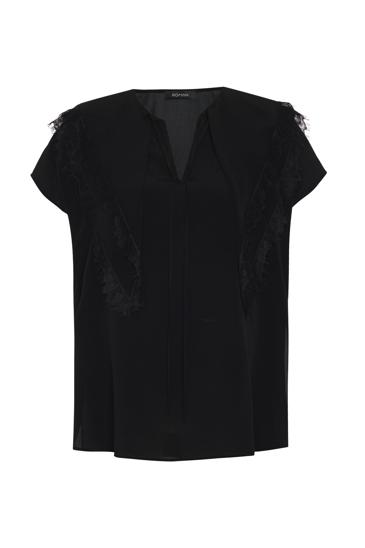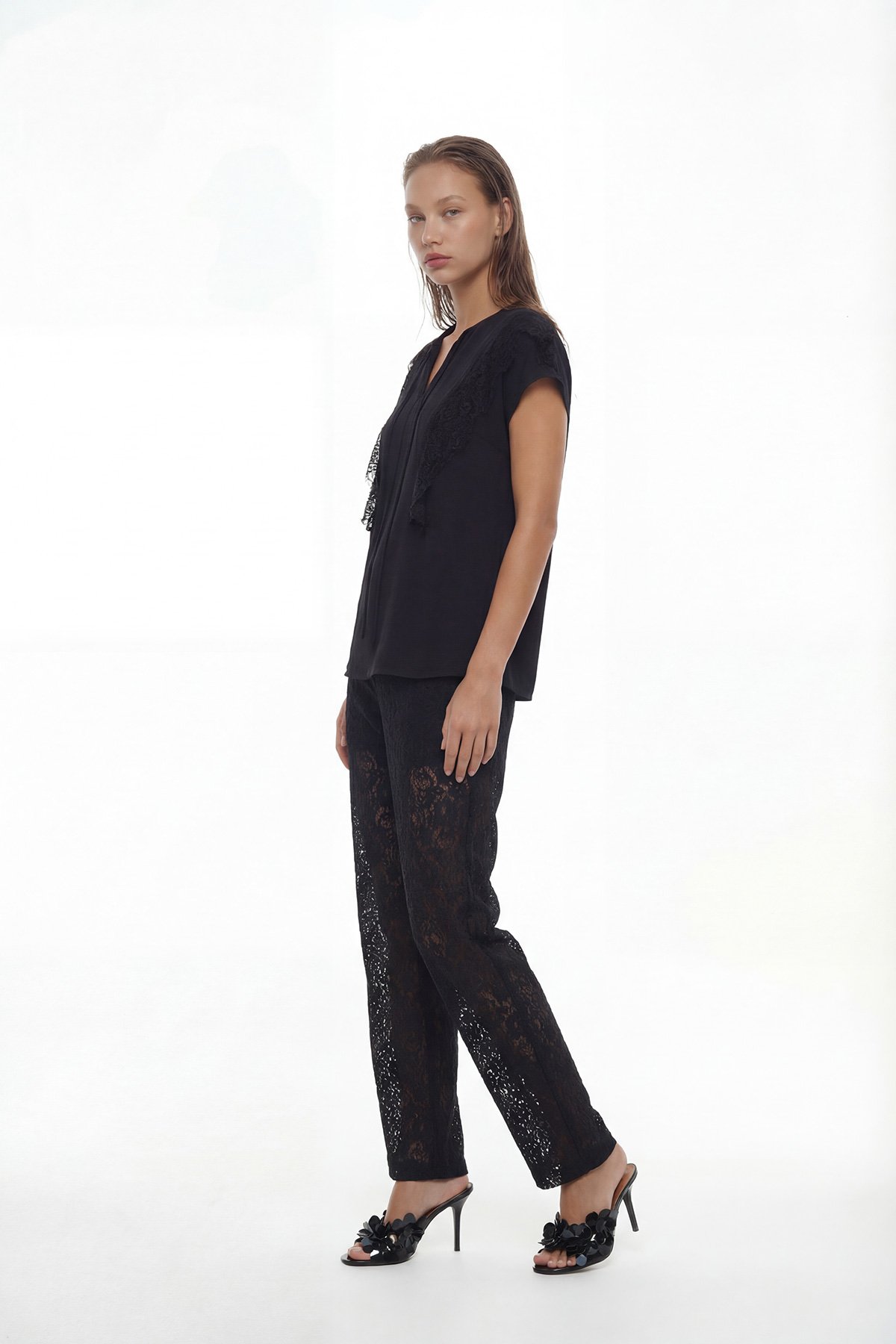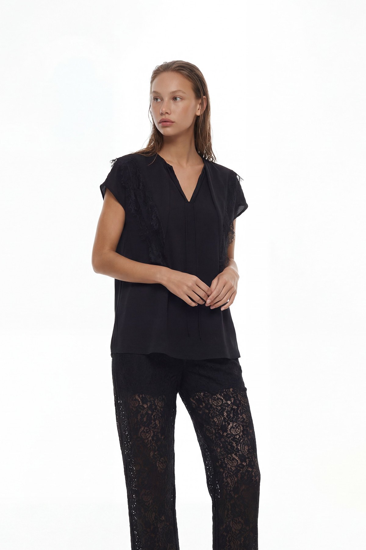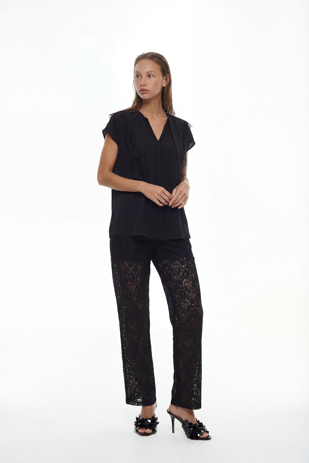 Düşük Omuzlu Dantelli Yaka Detaylı Bluz Siyah