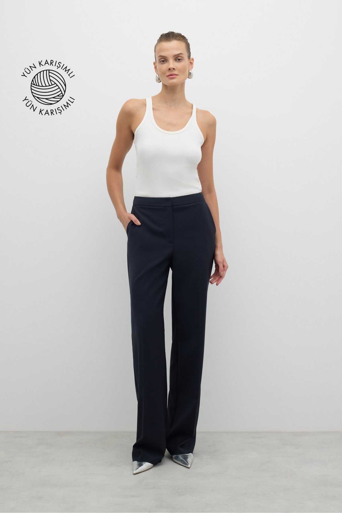 Yün Karışımlı Düz Paça Pantolon Lacivert