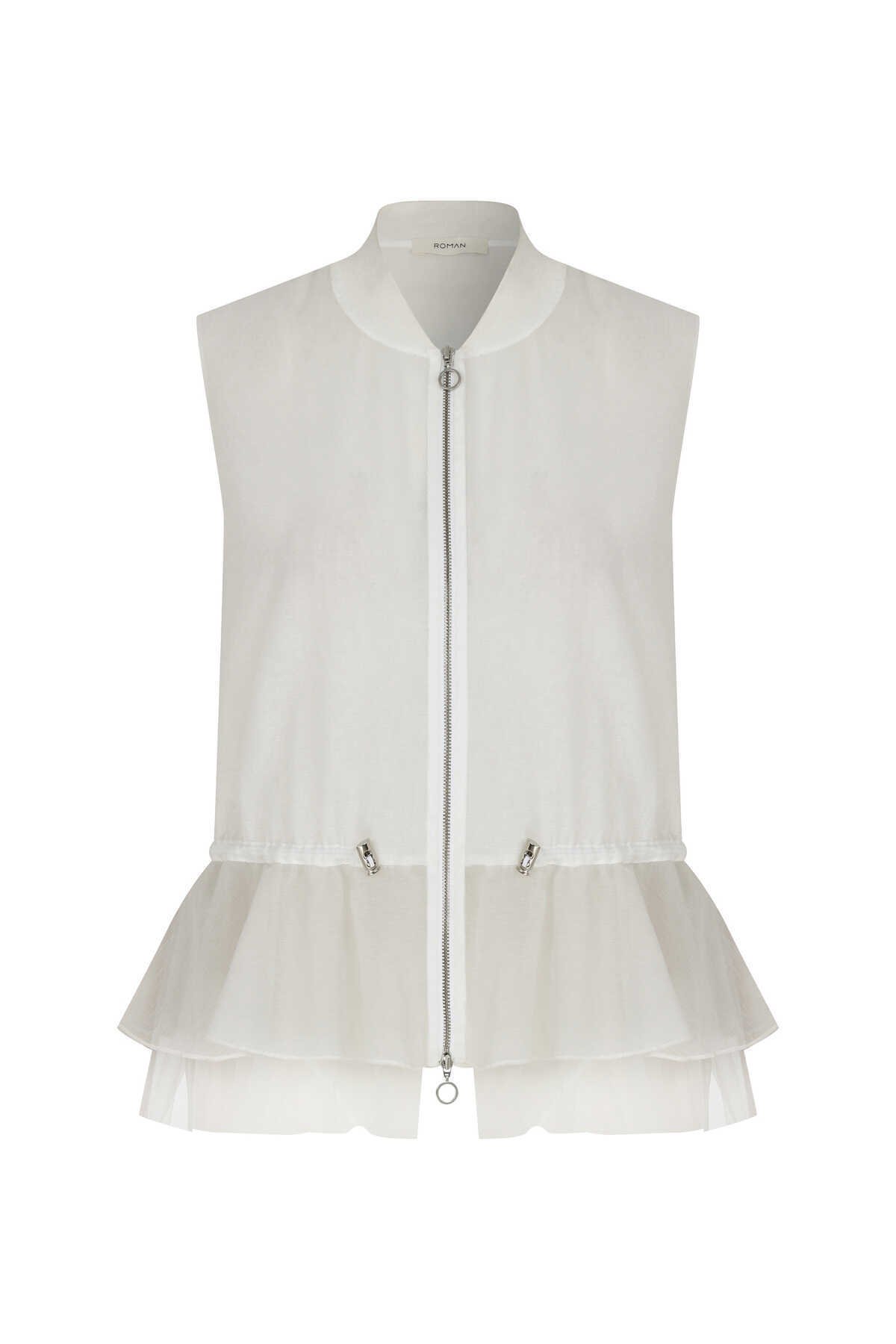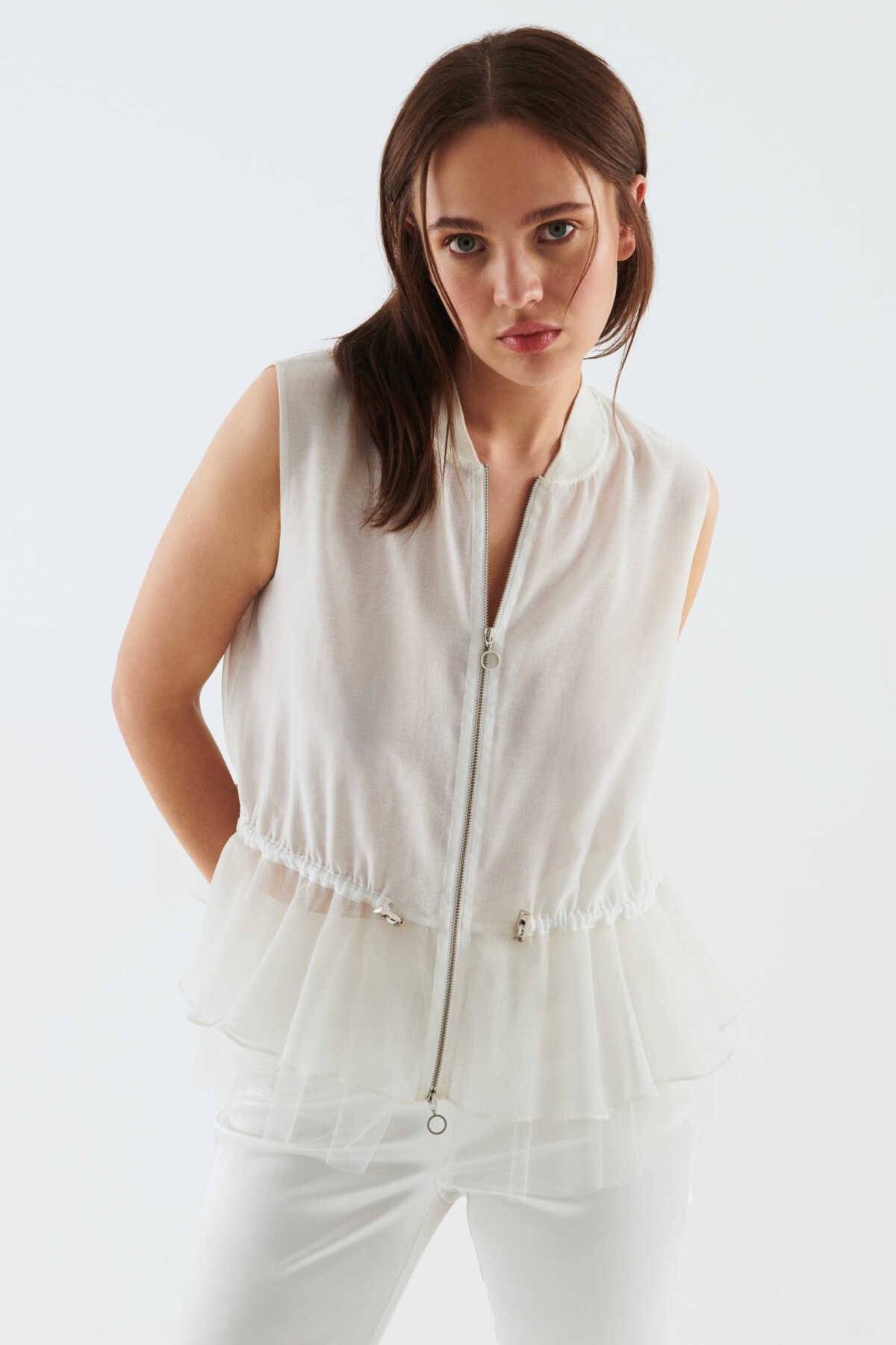 Fermuarlı Beli Lastikli Bluz Beyaz