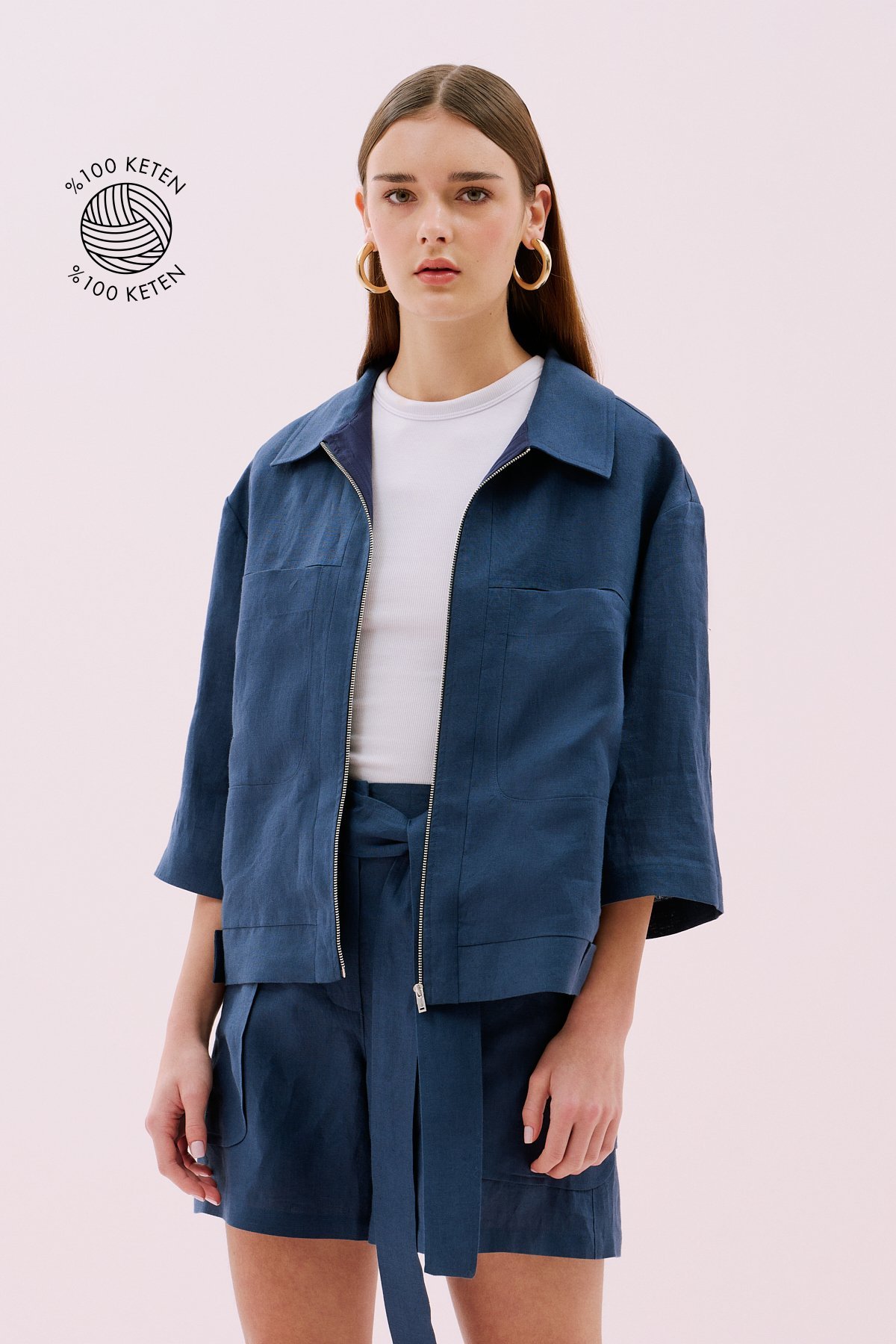 Fermuarlı Çift Cepli Truvakar Kol Keten Ceket Lacivert