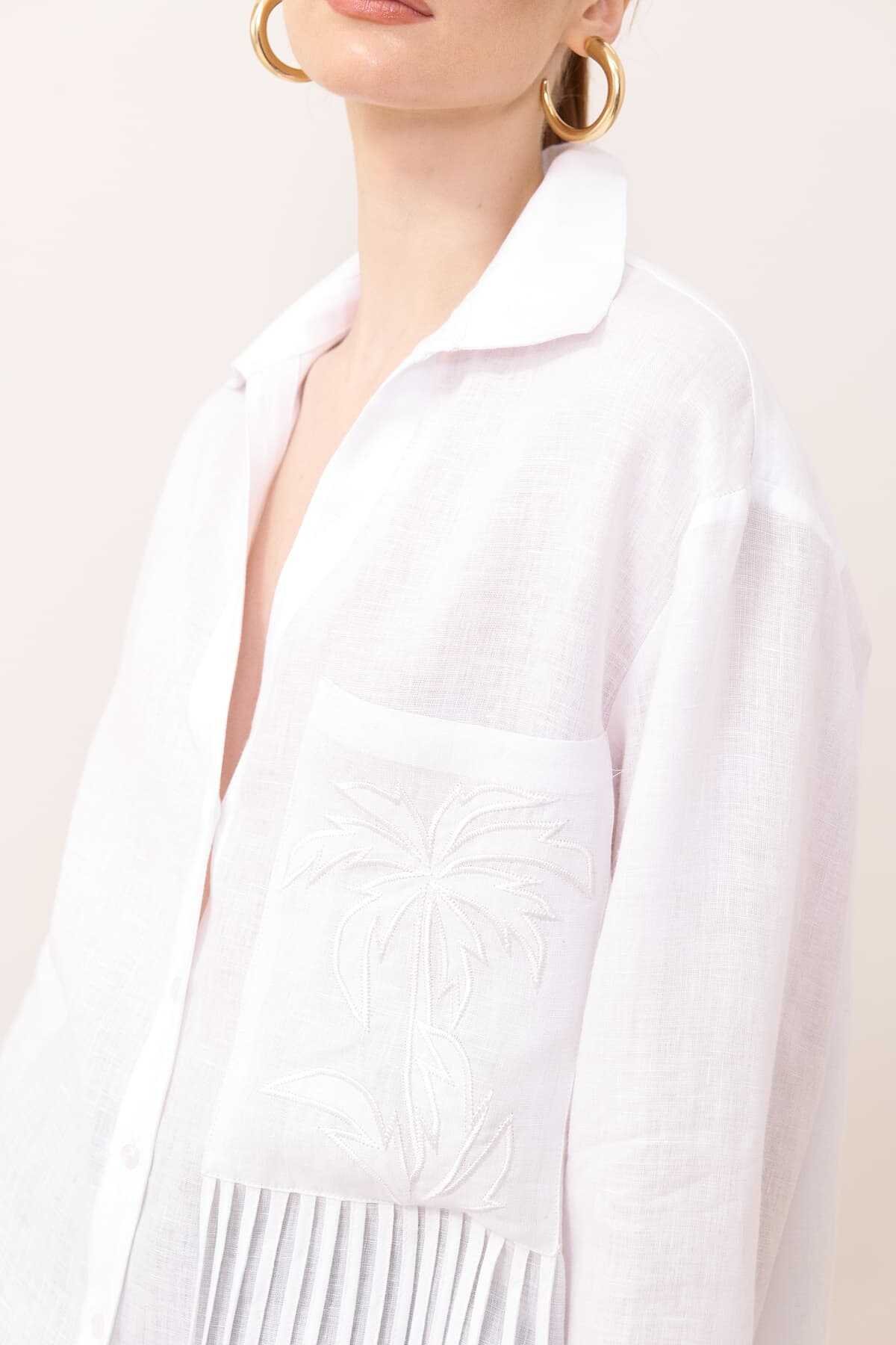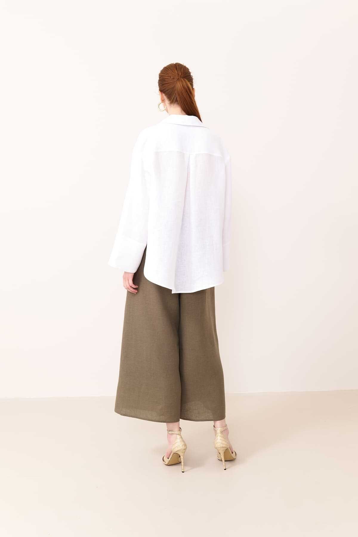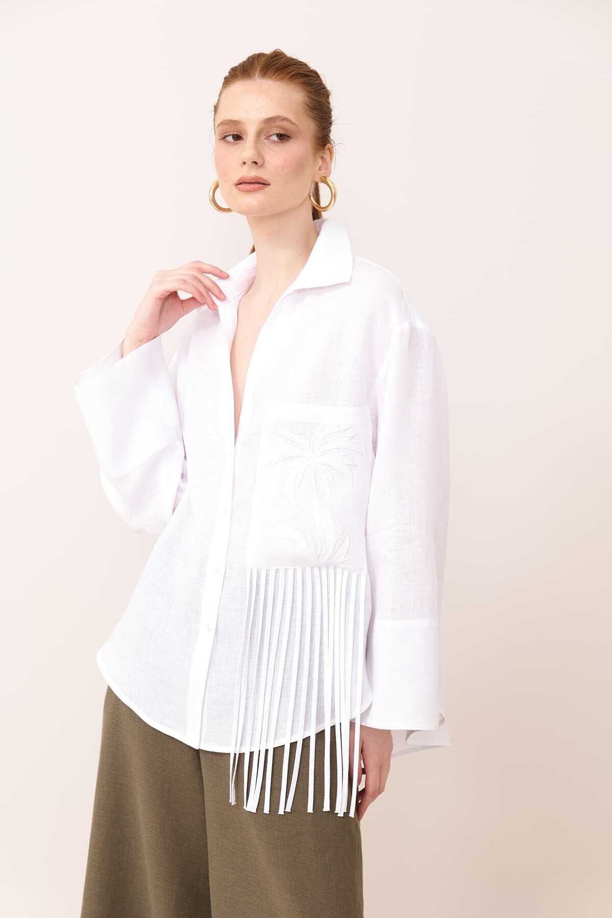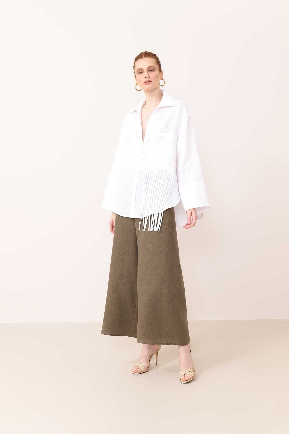 KUMAŞ İÇERİĞİ: Ana Kumaş: %100 Keten , YIKAMA TALİMATI: Yıkama Yapılmaz ÜTÜLEME TALİMATI: Düşük Isıda Ütüleme 110C Tersten Ütüleyiniz KURUTMA TALİMATI: Tamburlu Kurutma Yapılmaz ALT ÜRÜN GRUBU: Biye ve nakış detaylı geniş kesim keten gömlek MODEL ÖLÇÜLERİ: