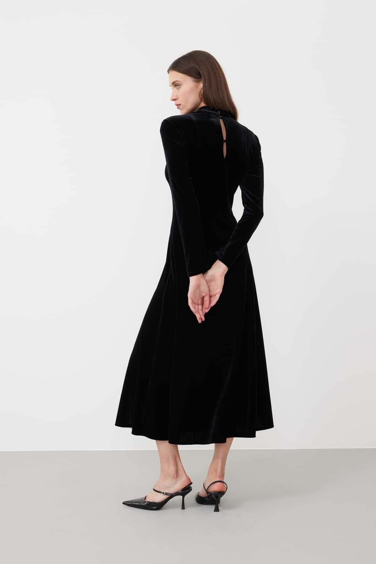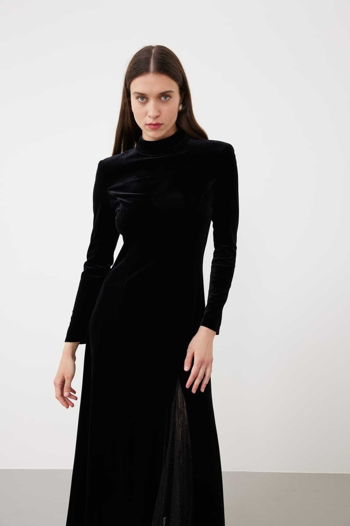 Midi Boy Yarım Balıkçı Kadife Elbise Siyah