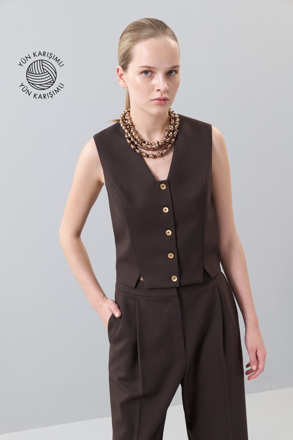 Yün Karışımlı V Yaka Önü Düğmeli Yelek Kahve