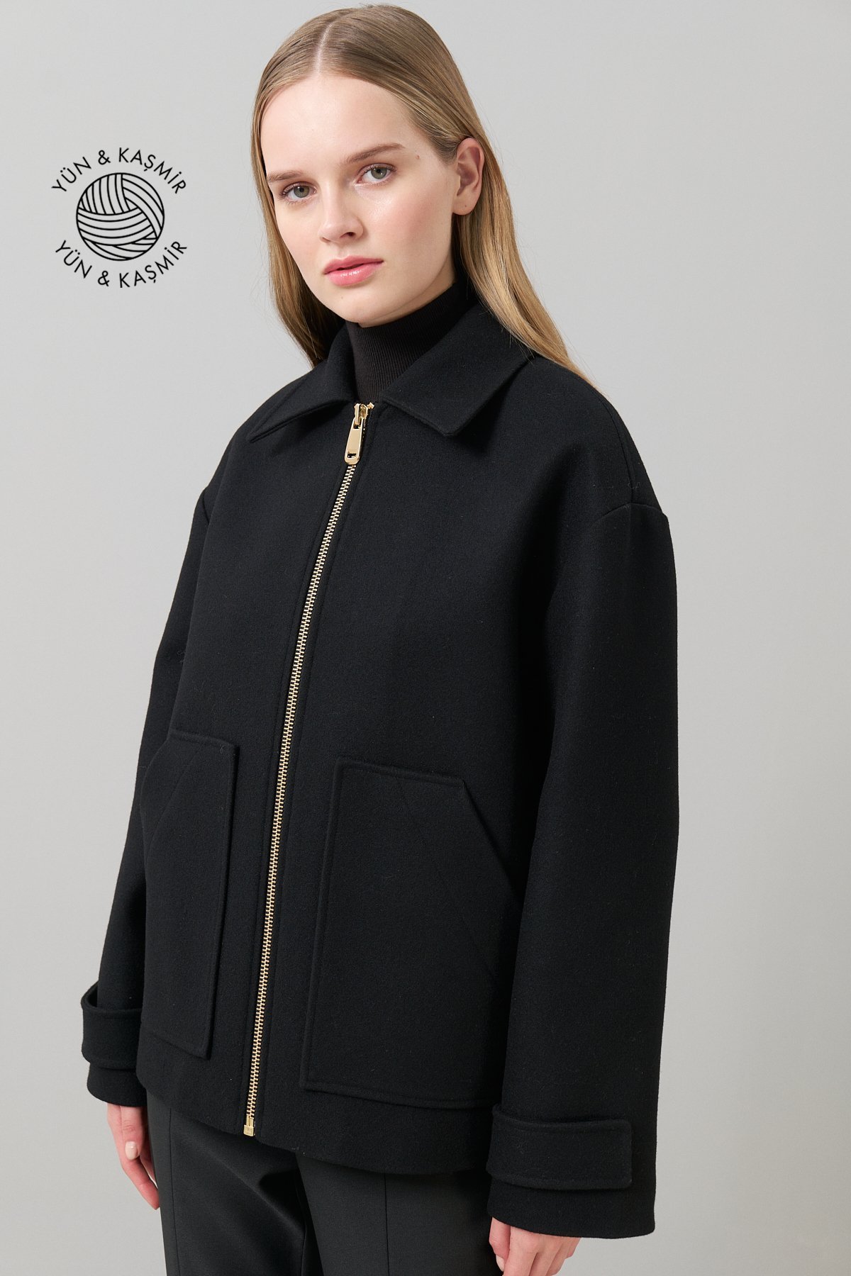 Kaşmir ve Yün Karışımlı Çift Cepli Fermuarlı Mont Siyah