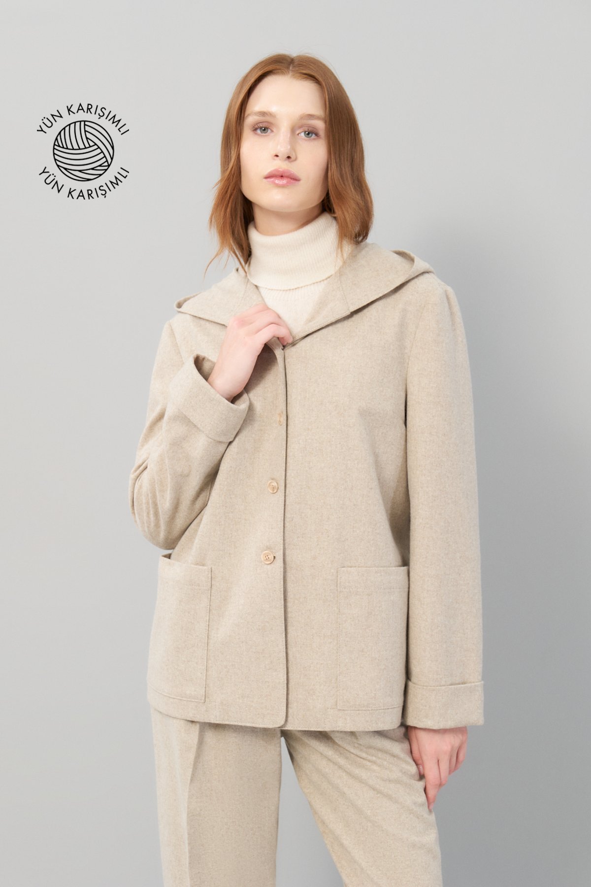 Kapüşonlu Çift Cepli Yün Kaban Bej