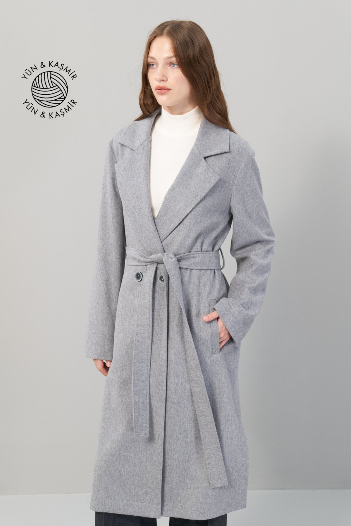 Kaşmir ve Yün Karışımlı Beli Kuşak Detaylı Kaban Gri