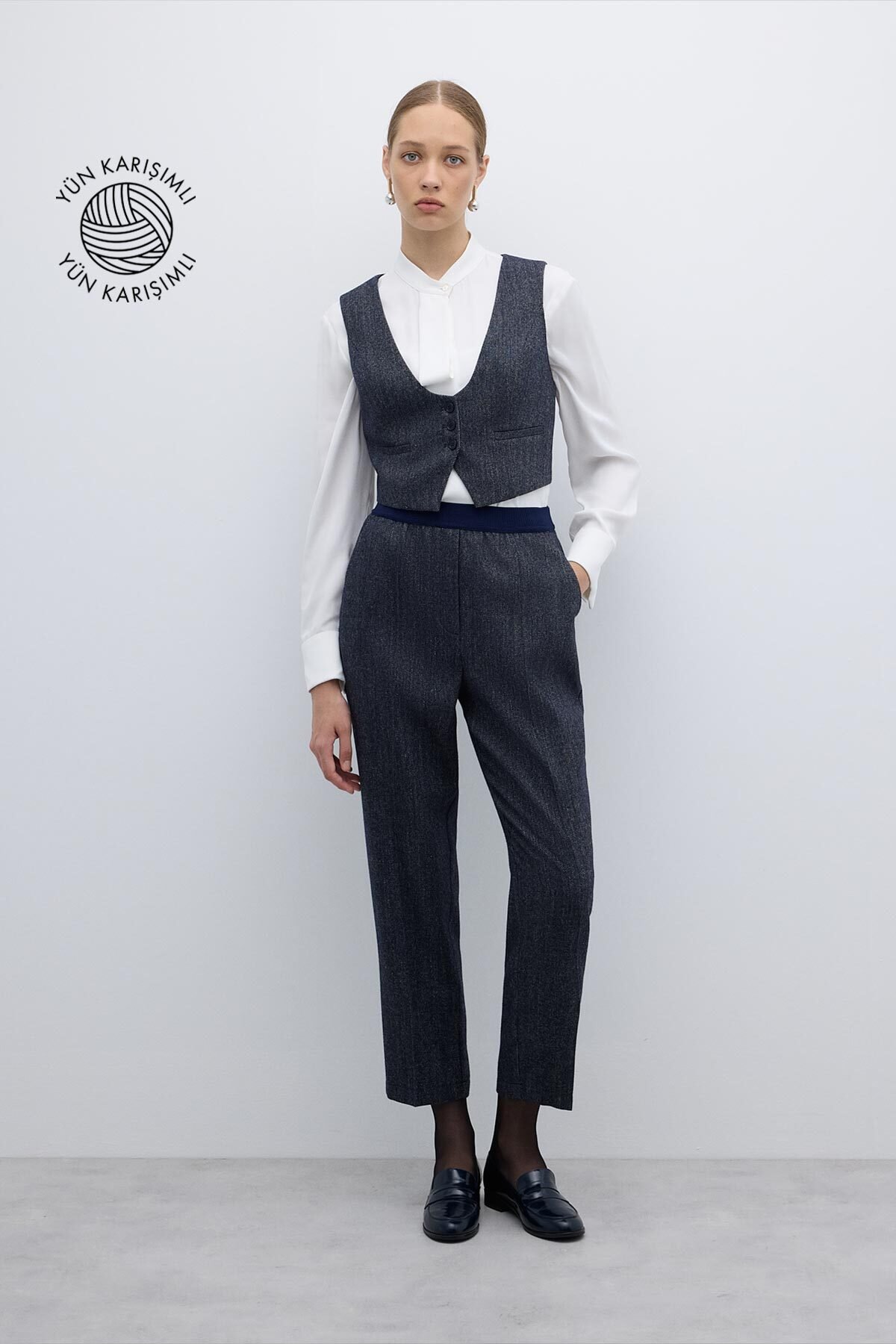 Yün Karışımlı Beli Lastikli Düz Paça Pantolon Lacivert