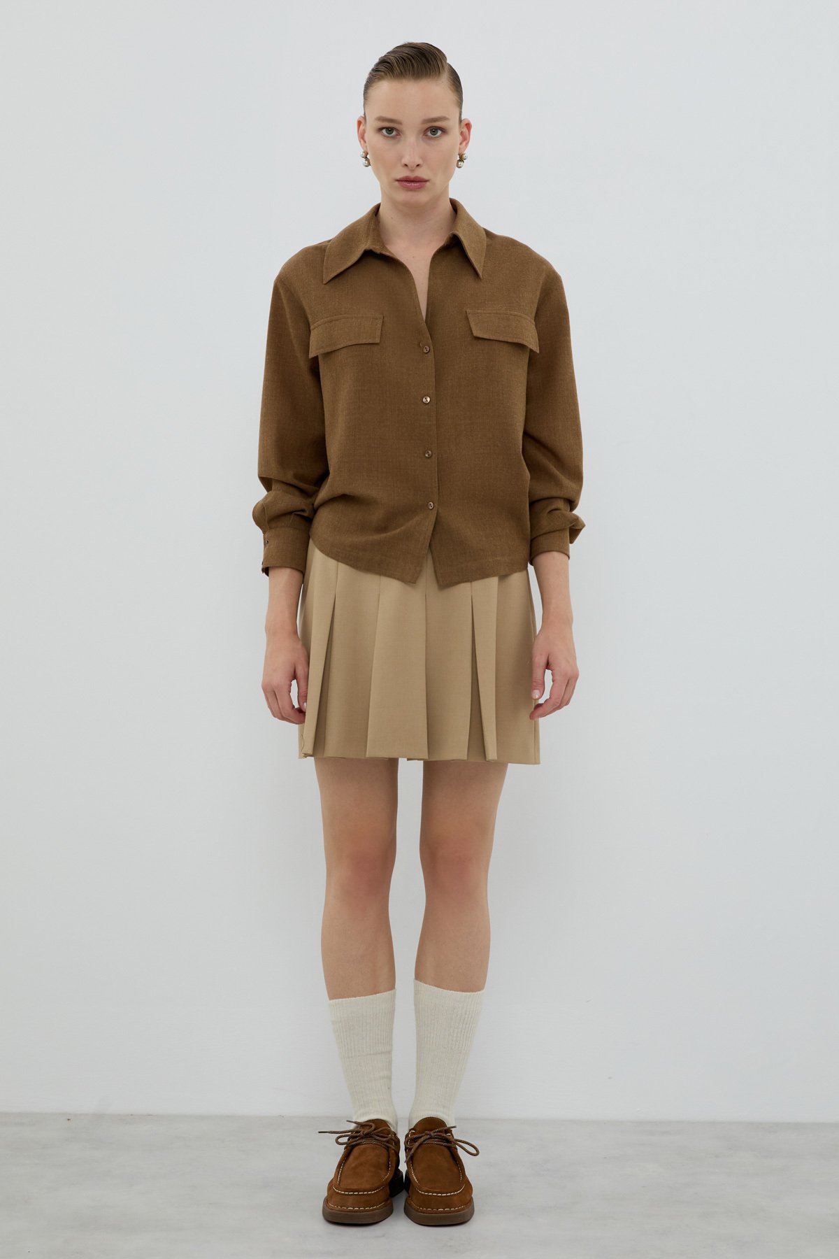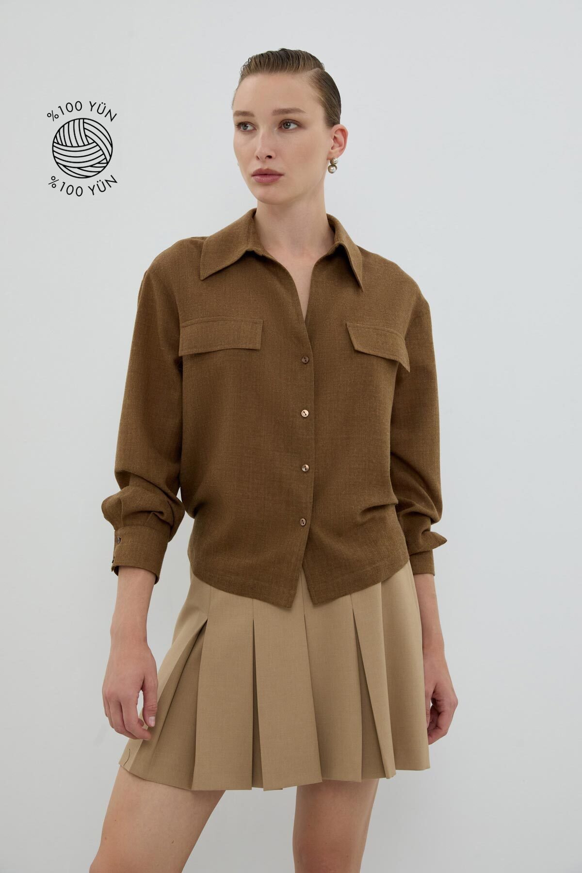 %100 Yün Süs Cep Kapaklı Gömlek Kahve - 1