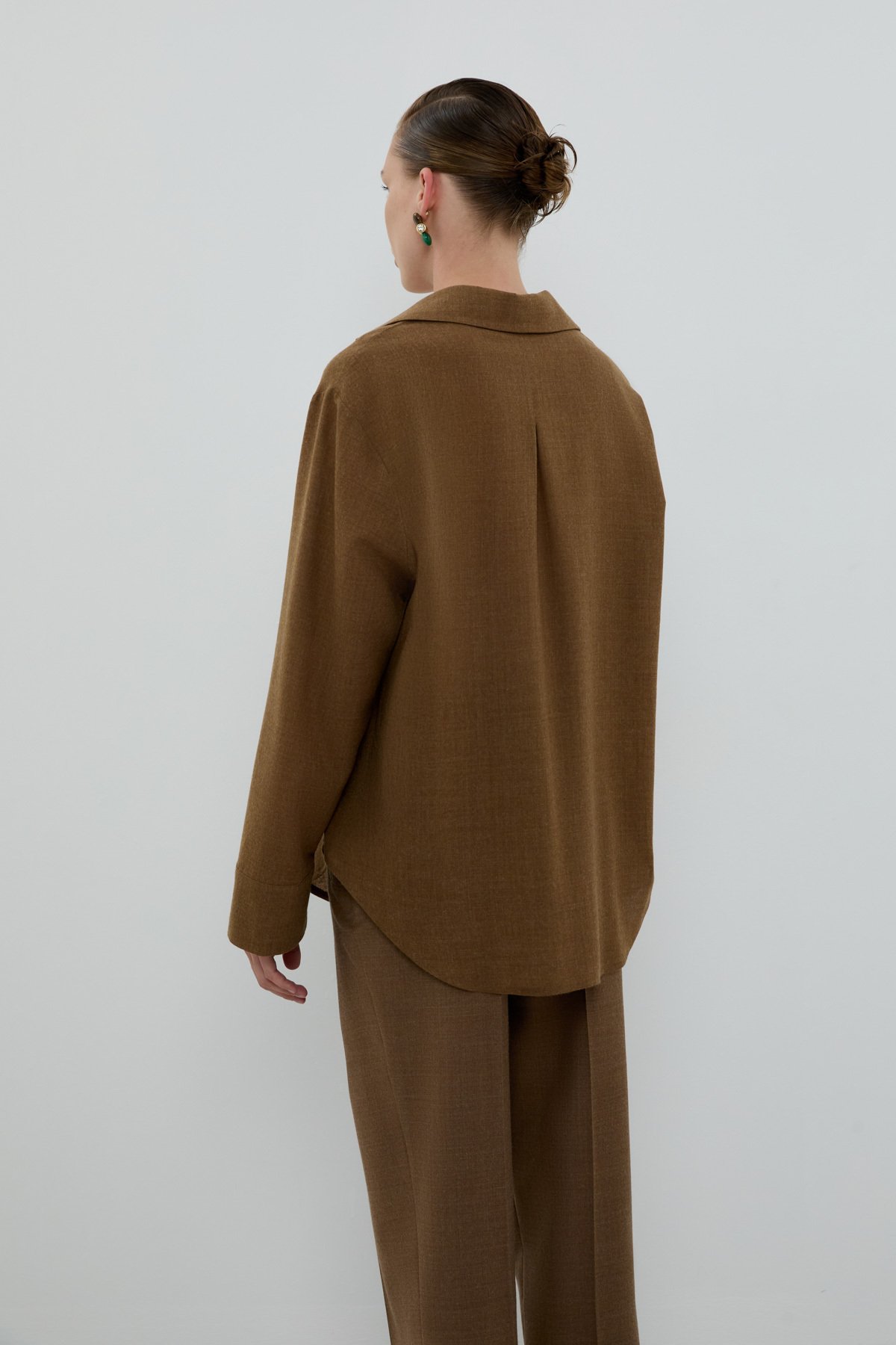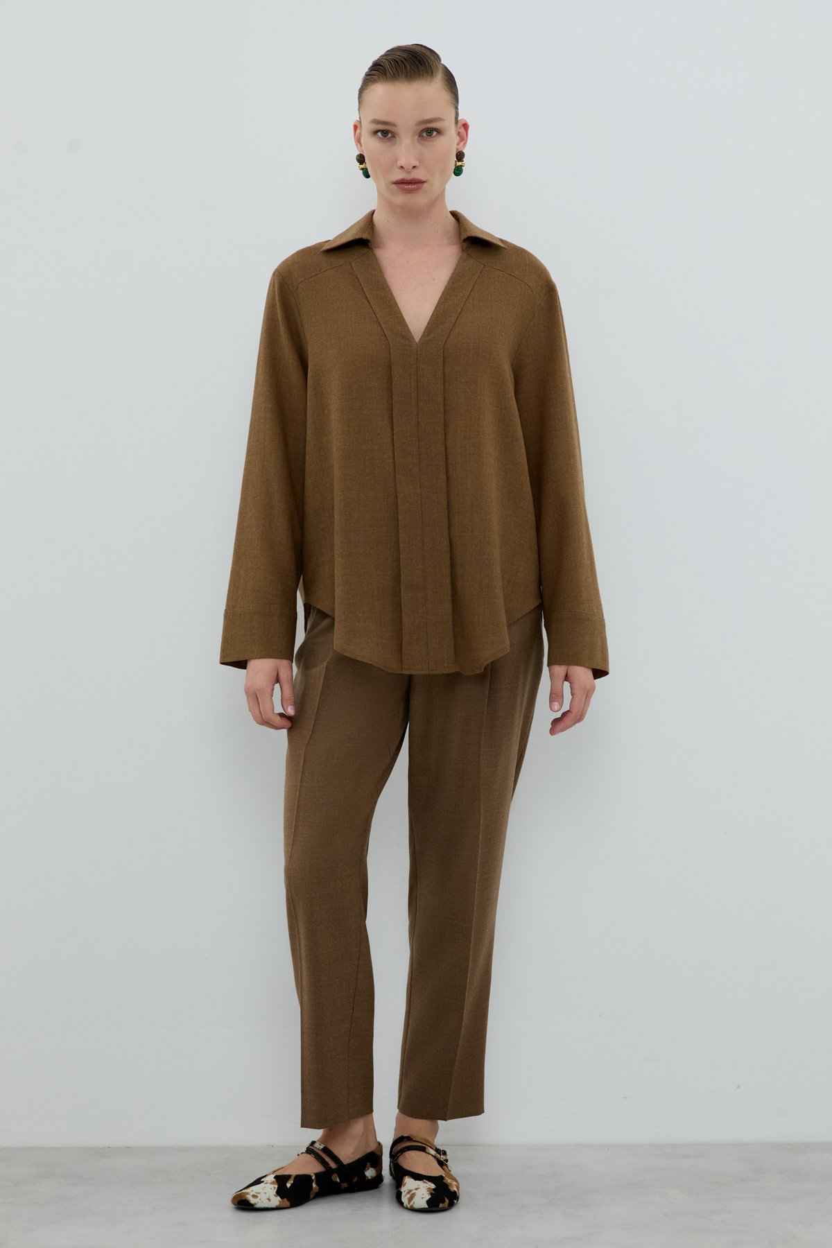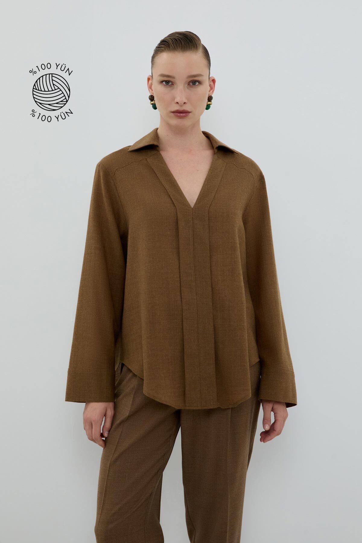 %100 Yün V Yaka Pili Detaylı Gömlek Kahve - 1