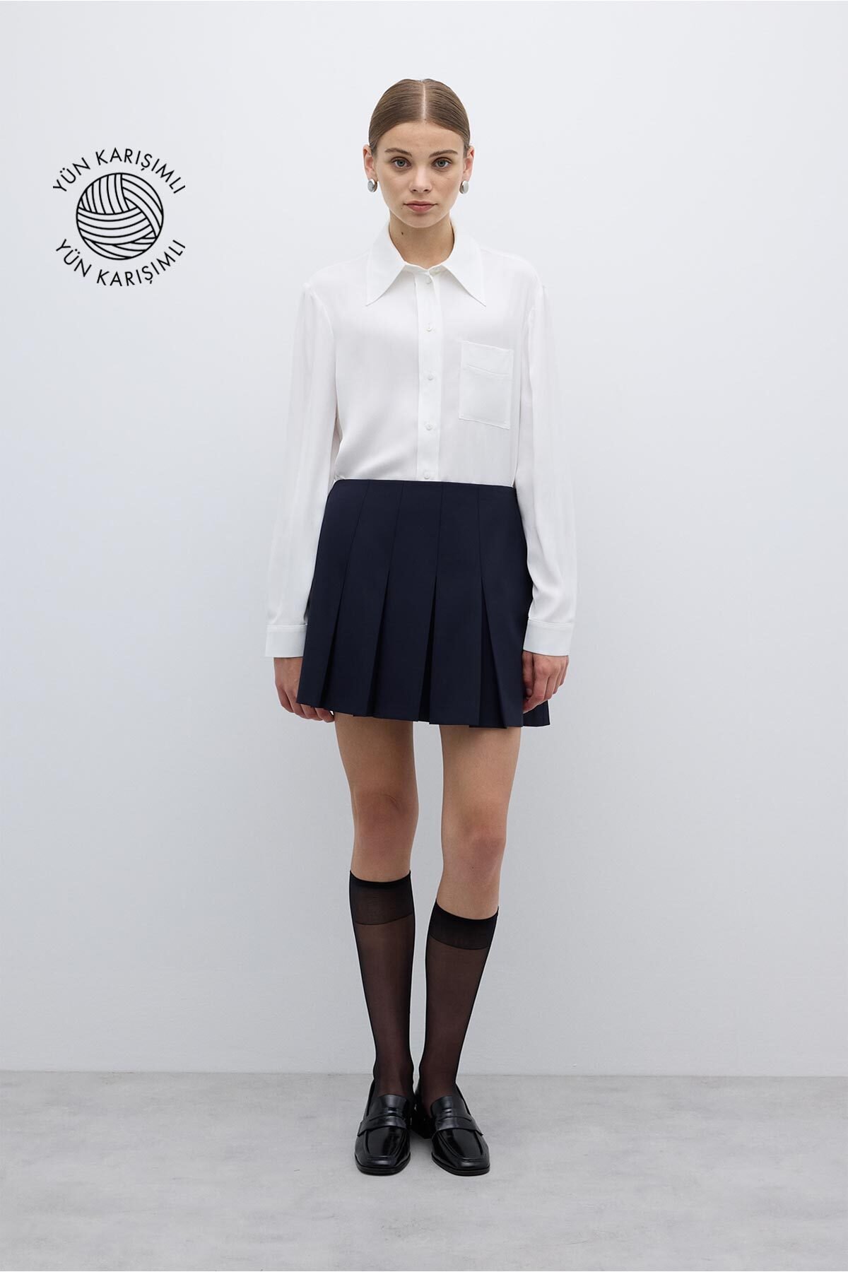 Yün Karışımlı Pileli Mini Etek Lacivert - 1