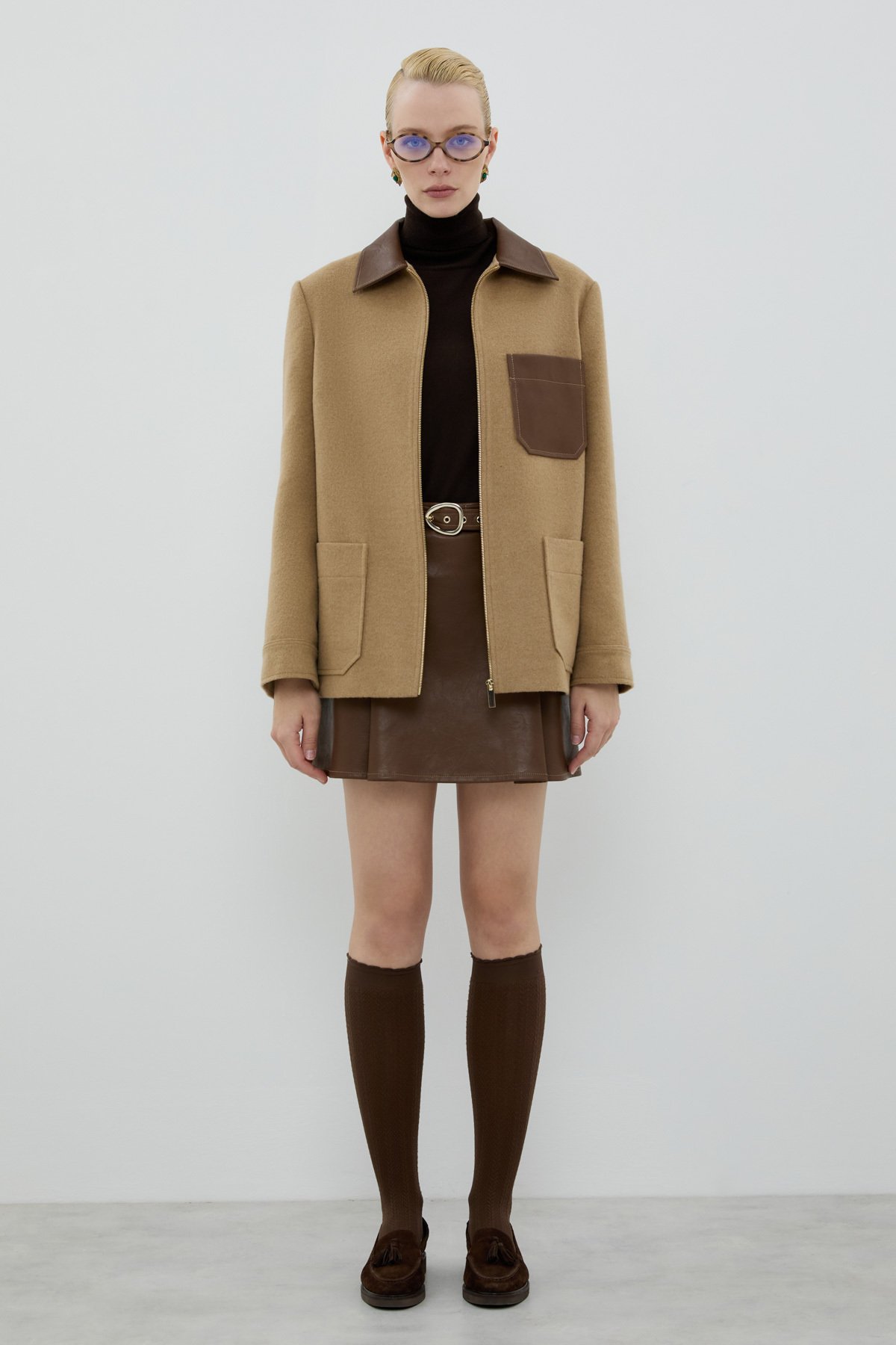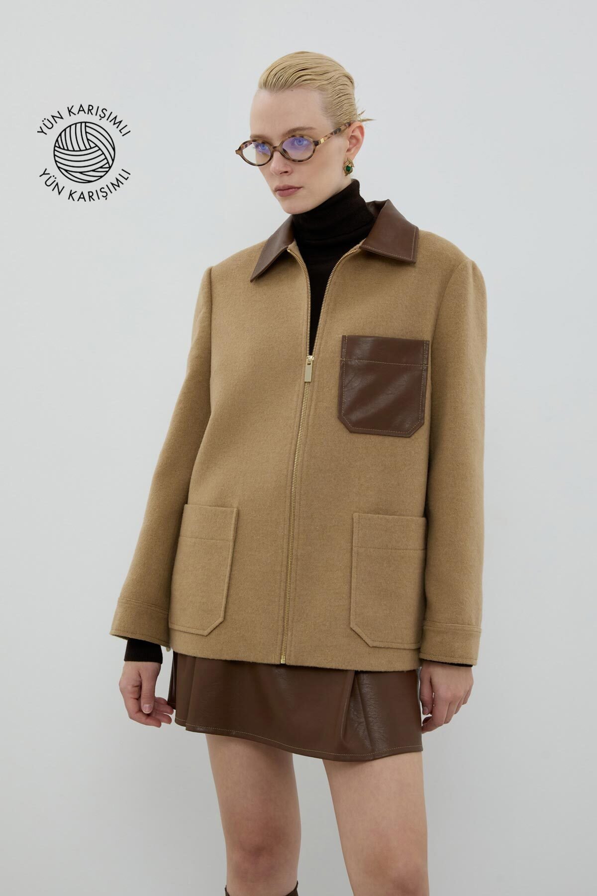 Yün Karışımlı Deri Detaylı Ceket Camel - 1