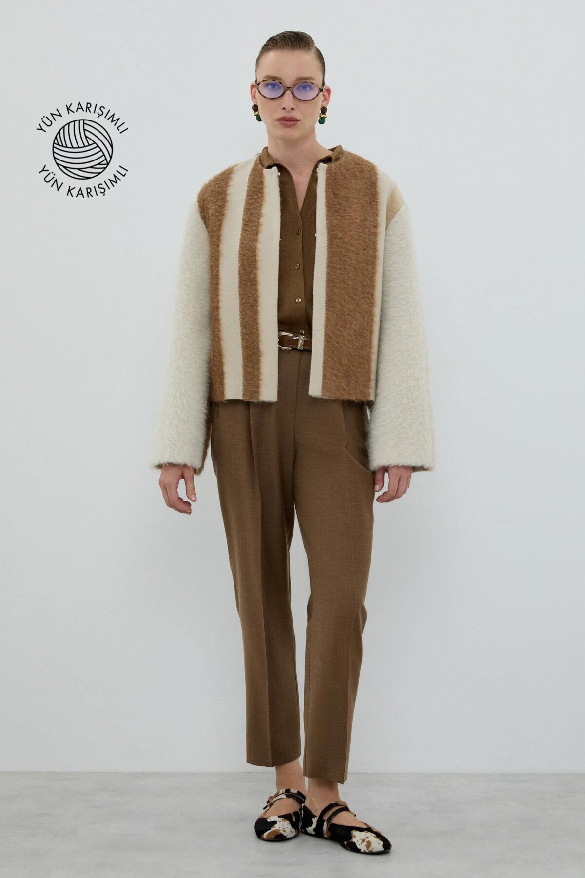 Yün Karışımlı Bisiklet Yaka Ceket Camel - Bej - 3
