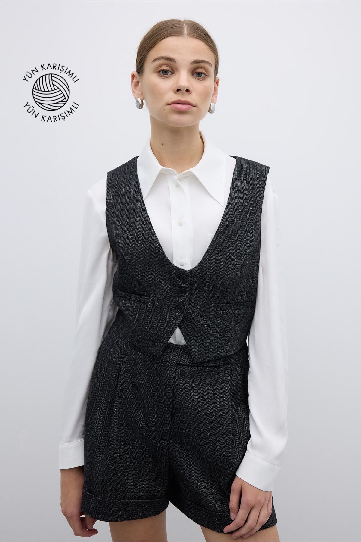 Yün Karışımlı U Yaka Önü Düğmeli Yelek Siyah - 1
