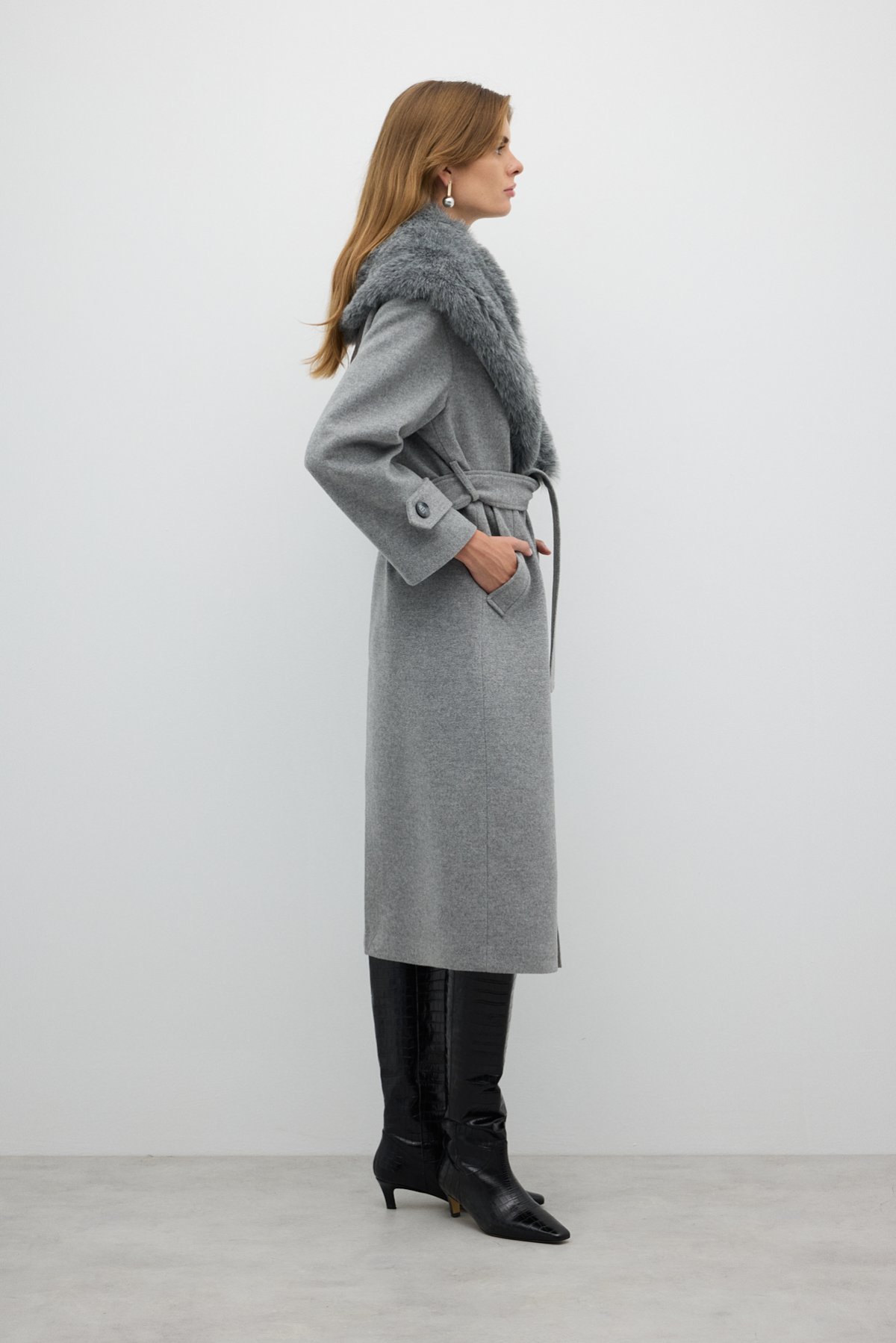 Çıkarılabilir Kürk Yakalı Kruvaze Yün Kaban Gri - 5