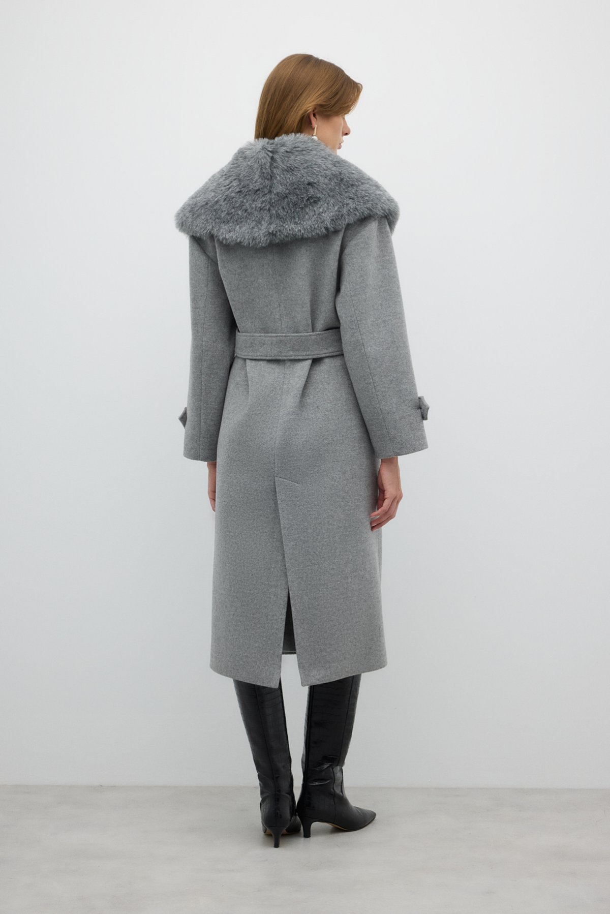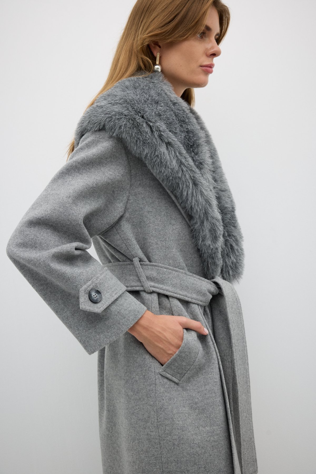Çıkarılabilir Kürk Yakalı Kruvaze Yün Kaban Gri - 3